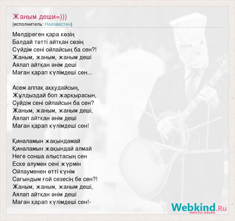Мөлдіреген қара көзің Балдай тәтті айтқан сөзің Сүйдім сені ойлайсың ба сен?! Жаным, жаным, жаным деші Аялап айтқан әнім деші Маған қарап күлімдеші сен... Асем аппақ аққудайсың, Жұлдыздай боп жарқырасын, Суйдiм сенi ойлайсын ба сен? Жаным, жаным, жаным деші, Аялап айтқан әнім деші Маған қарап күлімдеші сен! Қиналамын жақындамай Қиналамын жақындай алмай Неге сонша алыстасың сен Еске алумен сені жүрмін Ойлауменен өтті күнім Сағындым ғой сезесің бе сен?! Жаным, жаным, жаным деші, Аялап айтқан әнім деші Маған қарап күлімдеші сен!-