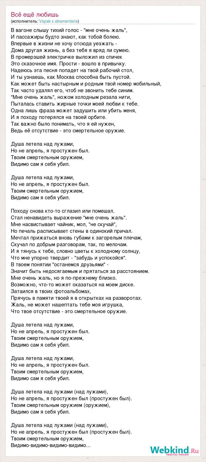 В вагоне слышу тихий голос - "мне очень жаль", И пассажиры будто знают, как тобой болею. Впервые в жизни не хочу отсюда уезжать - Дома другая жизнь, а без тебя я вряд ли сумею. В промерзшей электричке выложил из спичек Это сказочное имя. Прости - вошло в привычку. Надеюсь эта песня попадет на твой рабочий стол, И ты узнаешь, как Москва способна быть пустой. Как может быть настырным и родным твой номер мобильный, Так часто удалял его, чтоб не звонить тебе синим. "Мне очень жаль", ножом холодным резала нити, Пыталась ставить жирные точки моей любви к тебе. Одна лишь фраза может задушить или убить меня, И я походу потерялся на твоей орбите. Так важно было понимать, что я ей нужен, Ведь её отсутствие - это смертельное оружие. Душа летела над лужами, Но не апрель, я простужен был. Твоим смертельным оружием, Видимо сам я себя убил. Душа летела над лужами, Но не апрель, я простужен был. Твоим смертельным оружием, Видимо сам я себя убил. Походу снова кто-то сглазил или помешал. Стал ненавидеть выражение "мне очень жаль". Мне насвистывает чайник, мол, "не скучай", Но печаль расписывает стены в одинокий причал. Мечтал прижаться вновь губами к загорелым плечам, Скучал по добрым разговорам, так, по мелочам. И я тянусь к тебе, словно цветы к холодному солнцу, Что мне упорно твердит - "забудь и успокойся". В твоем понятии "останемся друзьями" - Значит быть недосягаемым и прятаться за расстоянием. Мне очень жаль, но я по-прежнему близко. Возможно, что-то может оказаться на моем диске. Затаился в твоих фотоальбомах, Прячусь в памяти твоей я в открытках на разворотах. Жаль, не может нашептать тебе моя игрушка, Что твое отсутствие - это смертельное оружие. Душа летела над лужами, Но не апрель, я простужен был. Твоим смертельным оружием, Видимо сам я себя убил. Душа летела над лужами, Но не апрель, я простужен был. Твоим смертельным оружием, Видимо сам я себя убил. Душа летела над лужами (над лужами), Но не апрель, я простужен был (простужен был). Твоим смертельным оружием (оружием), Видимо сам я себя убил. Душа летела над лужами (над лужами), Но не апрель, я простужен был (простужен был). Твоим смертельным оружием, Видимо-видимо-видимо-видимо...