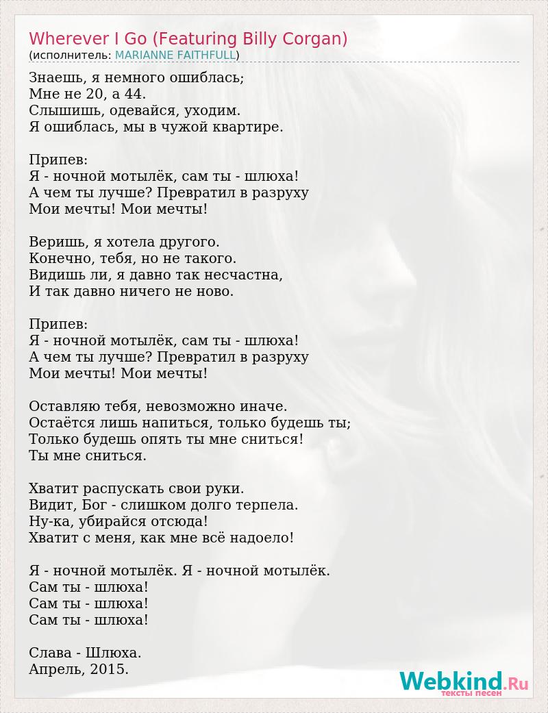 Знаешь, я немного ошиблась; Мне не 20, а 44. Слышишь, одевайся, уходим. Я ошиблась, мы в чужой квартире. Припев: Я - ночной мотылёк, сам ты - шлюха! А чем ты лучше? Превратил в разруху Мои мечты! Мои мечты! Веришь, я хотела другого. Конечно, тебя, но не такого. Видишь ли, я давно так несчастна, И так давно ничего не ново. Припев: Я - ночной мотылёк, сам ты - шлюха! А чем ты лучше? Превратил в разруху Мои мечты! Мои мечты! Оставляю тебя, невозможно иначе. Остаётся лишь напиться, только будешь ты; Только будешь опять ты мне сниться! Ты мне сниться. Хватит распускать свои руки. Видит, Бог - слишком долго терпела. Ну-ка, убирайся отсюда! Хватит с меня, как мне всё надоело! Я - ночной мотылёк. Я - ночной мотылёк. Сам ты - шлюха! Сам ты - шлюха! Сам ты - шлюха! Слава - Шлюха. Апрель, 2015.