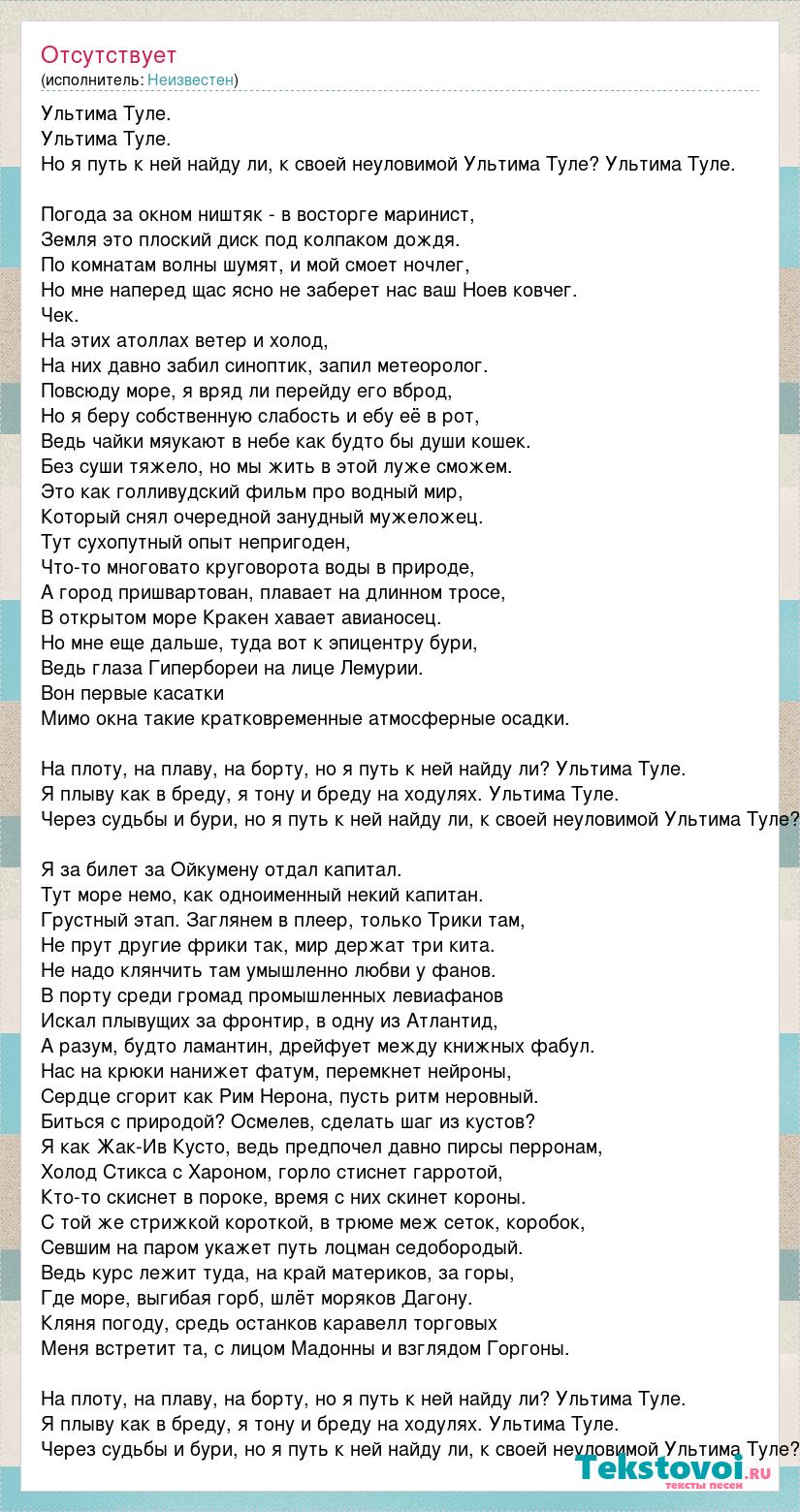 Ультима Туле. Ультима Туле. Но я путь к ней найду ли, к своей неуловимой Ультима Туле? Ультима Туле. Погода за окном ништяк - в восторге маринист, Земля это плоский диск под колпаком дождя. По комнатам волны шумят, и мой смоет ночлег, Но мне наперед щас ясно не заберет нас ваш Ноев ковчег. Чек. На этих атоллах ветер и холод, На них давно забил синоптик, запил метеоролог. Повсюду море, я вряд ли перейду его вброд, Но я беру собственную слабость и ебу её в рот, Ведь чайки мяукают в небе как будто бы души кошек. Без суши тяжело, но мы жить в этой луже сможем. Это как голливудский фильм про водный мир, Который снял очередной занудный мужеложец. Тут сухопутный опыт непригоден, Что-то многовато круговорота воды в природе, А город пришвартован, плавает на длинном тросе, В открытом море Кракен хавает авианосец. Но мне еще дальше, туда вот к эпицентру бури, Ведь глаза Гипербореи на лице Лемурии. Вон первые касатки Мимо окна такие кратковременные атмосферные осадки. На плоту, на плаву, на борту, но я путь к ней найду ли? Ультима Туле. Я плыву как в бреду, я тону и бреду на ходулях. Ультима Туле. Через судьбы и бури, но я путь к ней найду ли, к своей неуловимой Ультима Туле? Я за билет за Ойкумену отдал капитал. Тут море немо, как одноименный некий капитан. Грустный этап. Заглянем в плеер, только Трики там, Не прут другие фрики так, мир держат три кита. Не надо клянчить там умышленно любви у фанов. В порту среди громад промышленных левиафанов Искал плывущих за фронтир, в одну из Атлантид, А разум, будто ламантин, дрейфует между книжных фабул. Нас на крюки нанижет фатум, перемкнет нейроны, Сердце сгорит как Рим Нерона, пусть ритм неровный. Биться с природой? Осмелев, сделать шаг из кустов? Я как Жак-Ив Кусто, ведь предпочел давно пирсы перронам, Холод Стикса с Хароном, горло стиснет гарротой, Кто-то скиснет в пороке, время с них скинет короны. С той же стрижкой короткой, в трюме меж сеток, коробок, Севшим на паром укажет путь лоцман седобородый. Ведь курс лежит туда, на край материков, за горы, Где море, выгибая горб, шлёт моряков Дагону. Кляня погоду, средь останков каравелл торговых Меня встретит та, с лицом Мадонны и взглядом Горгоны. На плоту, на плаву, на борту, но я путь к ней найду ли? Ультима Туле. Я плыву как в бреду, я тону и бреду на ходулях. Ультима Туле. Через судьбы и бури, но я путь к ней найду ли, к своей неуловимой Ультима Туле?