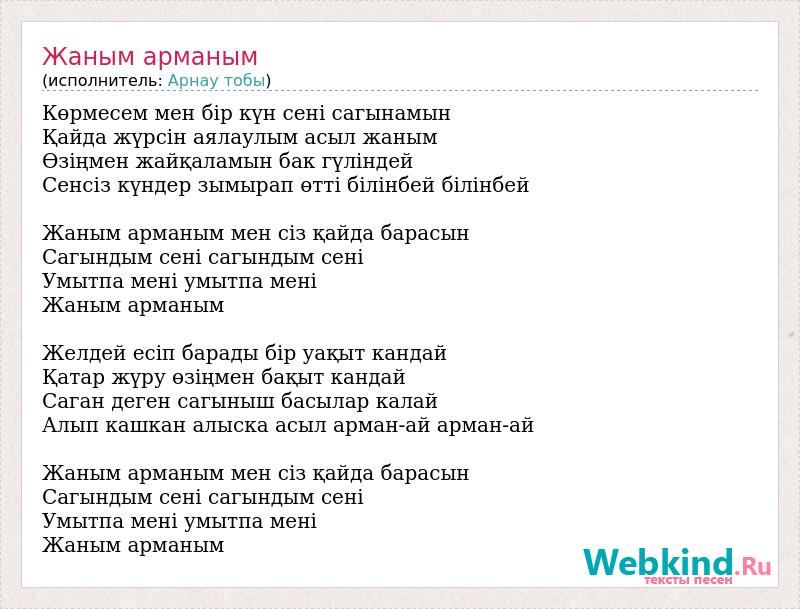 Көрмесем мен бір күн сені сагынамын Қайда жүрсін аялаулым асыл жаным Өзіңмен жайқаламын бак гүліндей Сенсіз күндер зымырап өтті білінбей білінбей Жаным арманым мен сіз қайда барасын Сагындым сені сагындым сені Умытпа мені умытпа мені Жаным арманым Желдей есіп барады бір уақыт кандай Қатар жүру өзіңмен бақыт кандай Саган деген сагыныш басылар калай Алып кашкан алыска асыл арман-ай арман-ай Жаным арманым мен сіз қайда барасын Сагындым сені сагындым сені Умытпа мені умытпа мені Жаным арманым