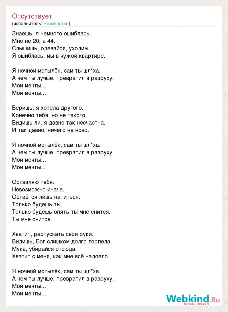 Знаешь, я немного ошиблась. Мне не 20, а 44. Слышишь, одевайся, уходим. Я ошиблась, мы в чужой квартире. Я ночной мотылёк, сам ты шл*ха. А чем ты лучше, превратил в разруху. Мои мечты... Мои мечты... Веришь, я хотела другого. Конечно тебя, но не такого. Видишь ли, я давно так несчастна. И так давно, ничего не ново. Я ночной мотылёк, сам ты шл*ха. А чем ты лучше, превратил в разруху. Мои мечты... Мои мечты... Оставляю тебя. Невозможно иначе. Остаётся лишь напиться. Только будешь ты. Только будешь опять ты мне снится. Ты мне снится. Хватит, распускать свои руки. Видишь, Бог слишком долго терпела. Мука, убирайся отсюда. Хватит с меня, как мне всё надоело. Я ночной мотылёк, сам ты шл*ха. А чем ты лучше, превратил в разруху. Мои мечты... Мои мечты...