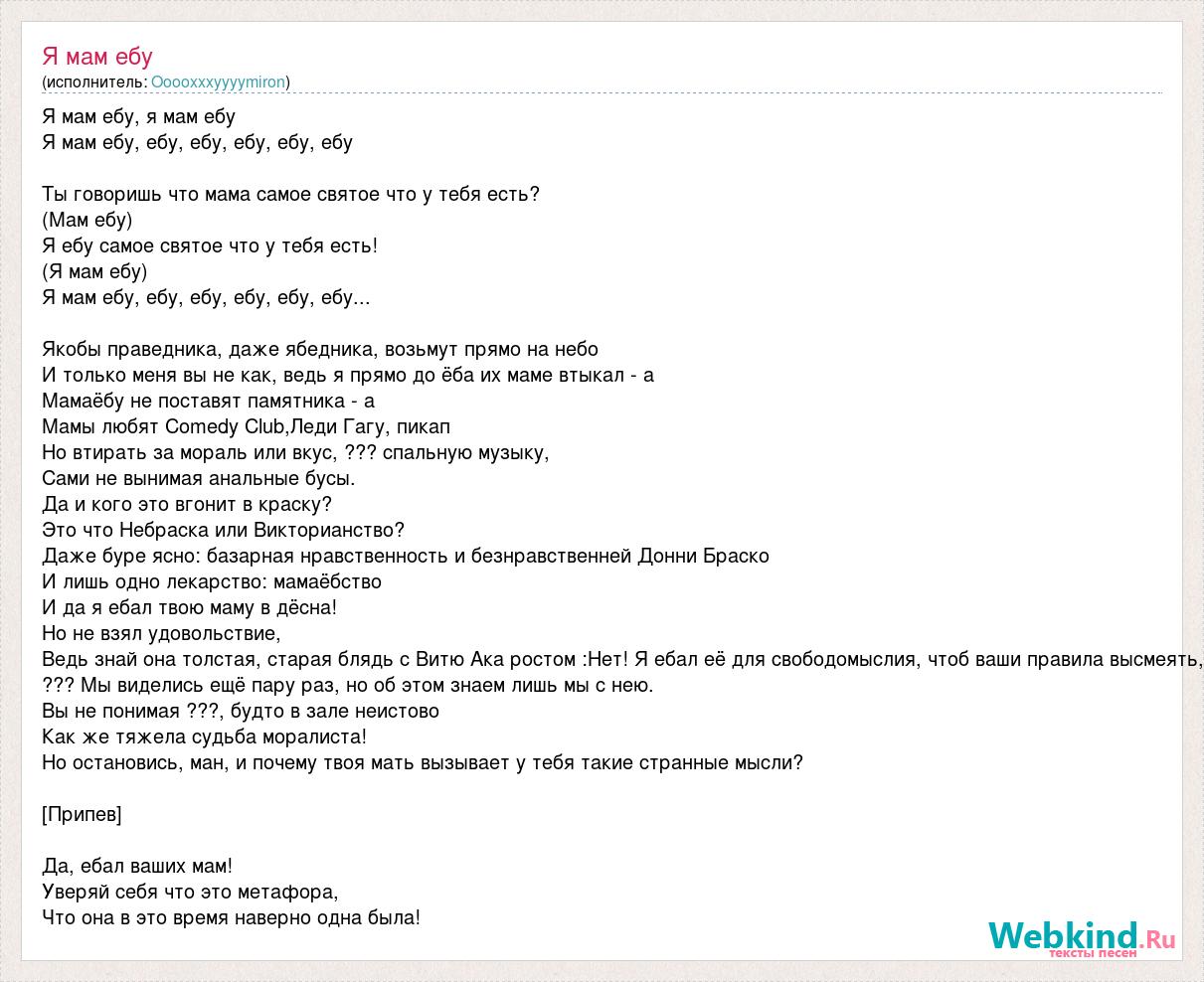 Я мам ебу, я мам ебу Я мам ебу, ебу, ебу, ебу, ебу, ебу Ты говоришь что мама самое святое что у тебя есть? (Мам ебу) Я ебу самое святое что у тебя есть! (Я мам ебу) Я мам ебу, ебу, ебу, ебу, ебу, ебу... Якобы праведника, даже ябедника, возьмут прямо на небо И только меня вы не как, ведь я прямо до ёба их маме втыкал - а Мамаёбу не поставят памятника - а Мамы любят Comedy Club,Леди Гагу, пикап Но втирать за мораль или вкус, ??? спальную музыку, Сами не вынимая анальные бусы. Да и кого это вгонит в краску? Это что Небраска или Викторианство? Даже буре ясно: базарная нравственность и безнравственней Донни Браско И лишь одно лекарство: мамаёбство И да я ебал твою маму в дёсна! Но не взял удовольствие, Ведь знай она толстая, старая блядь с Витю Ака ростом :Нет! Я ебал её для свободомыслия, чтоб ваши правила высмеять, ??? Мы виделись ещё пару раз, но об этом знаем лишь мы с нею. Вы не понимая ???, будто в зале неистово Как же тяжела судьба моралиста! Но остановись, ман, и почему твоя мать вызывает у тебя такие странные мысли? [Припев] Да, ебал ваших мам! Уверяй себя что это метафора, Что она в это время наверно одна была!