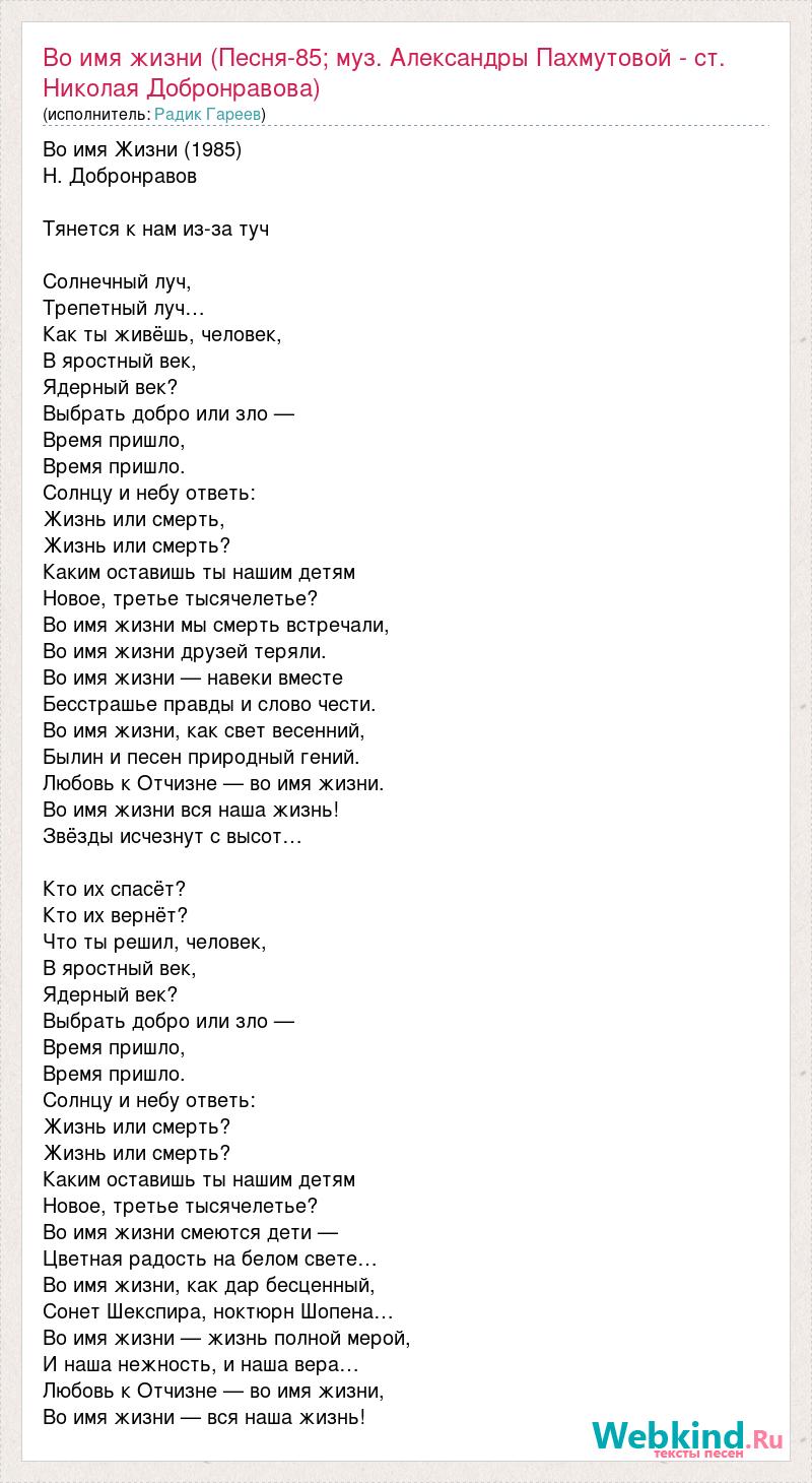 Во имя Жизни (1985) Н. Добронравов Тянется к нам из-за туч Солнечный луч, Трепетный луч… Как ты живёшь, человек, В яростный век, Ядерный век? Выбрать добро или зло — Время пришло, Время пришло. Солнцу и небу ответь: Жизнь или смерть, Жизнь или смерть? Каким оставишь ты нашим детям Новое, третье тысячелетье? Во имя жизни мы смерть встречали, Во имя жизни друзей теряли. Во имя жизни — навеки вместе Бесстрашье правды и слово чести. Во имя жизни, как свет весенний, Былин и песен природный гений. Любовь к Отчизне — во имя жизни. Во имя жизни вся наша жизнь! Звёзды исчезнут с высот… Кто их спасёт? Кто их вернёт? Что ты решил, человек, В яростный век, Ядерный век? Выбрать добро или зло — Время пришло, Время пришло. Солнцу и небу ответь: Жизнь или смерть? Жизнь или смерть? Каким оставишь ты нашим детям Новое, третье тысячелетье? Во имя жизни смеются дети — Цветная радость на белом свете… Во имя жизни, как дар бесценный, Сонет Шекспира, ноктюрн Шопена… Во имя жизни — жизнь полной мерой, И наша нежность, и наша вера… Любовь к Отчизне — во имя жизни, Во имя жизни — вся наша жизнь!