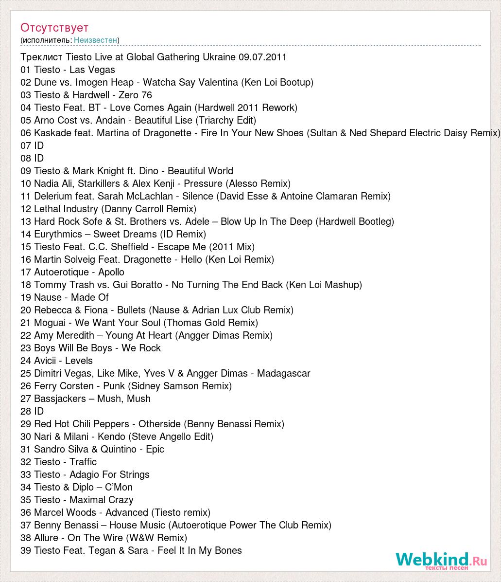 Треклист Tiesto Live at Global Gathering Ukraine 09.07.2011 01 Tiesto - Las Vegas 02 Dune vs. Imogen Heap - Watcha Say Valentina (Ken Loi Bootup) 03 Tiesto & Hardwell - Zero 76 04 Tiesto Feat. BT - Love Comes Again (Hardwell 2011 Rework) 05 Arno Cost vs. Andain - Beautiful Lise (Triarchy Edit) 06 Kaskade feat. Martina of Dragonette - Fire In Your New Shoes (Sultan & Ned Shepard Electric Daisy Remix) 07 ID 08 ID 09 Tiesto & Mark Knight ft. Dino - Beautiful World 10 Nadia Ali, Starkillers & Alex Kenji - Pressure (Alesso Remix) 11 Delerium feat. Sarah McLachlan - Silence (David Esse & Antoine Clamaran Remix) 12 Lethal Industry (Danny Carroll Remix) 13 Hard Rock Sofe & St. Brothers vs. Adele – Blow Up In The Deep (Hardwell Bootleg) 14 Eurythmics – Sweet Dreams (ID Remix) 15 Tiesto Feat. C.C. Sheffield - Escape Me (2011 Mix) 16 Martin Solveig Feat. Dragonette - Hello (Ken Loi Remix) 17 Autoerotique - Apollo 18 Tommy Trash vs. Gui Boratto - No Turning The End Back (Ken Loi Mashup) 19 Nause - Made Of 20 Rebecca & Fiona - Bullets (Nause & Adrian Lux Club Remix) 21 Moguai - We Want Your Soul (Thomas Gold Remix) 22 Amy Meredith – Young At Heart (Angger Dimas Remix) 23 Boys Will Be Boys - We Rock 24 Avicii - Levels 25 Dimitri Vegas, Like Mike, Yves V & Angger Dimas - Madagascar 26 Ferry Corsten - Punk (Sidney Samson Remix) 27 Bassjackers – Mush, Mush 28 ID 29 Red Hot Chili Peppers - Otherside (Benny Benassi Remix) 30 Nari & Milani - Kendo (Steve Angello Edit) 31 Sandro Silva & Quintino - Epic 32 Tiesto - Traffic 33 Tiesto - Adagio For Strings 34 Tiesto & Diplo – C’Mon 35 Tiesto - Maximal Crazy 36 Marcel Woods - Advanced (Tiesto remix) 37 Benny Benassi – House Music (Autoerotique Power The Club Remix) 38 Allure - On The Wire (W&W Remix) 39 Tiesto Feat. Tegan & Sara - Feel It In My Bones