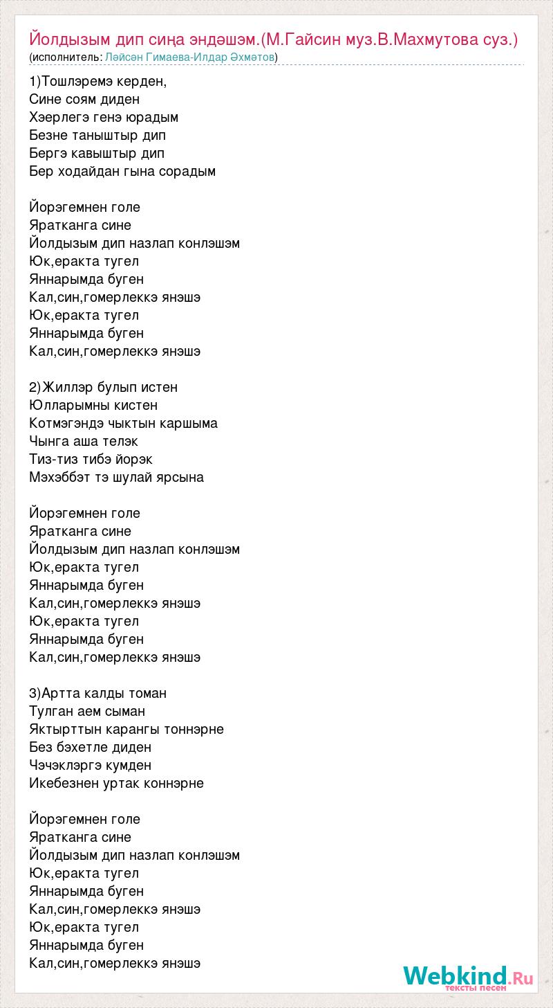 1)Тошлэремэ керден, Сине соям диден Хэерлегэ генэ юрадым Безне таныштыр дип Бергэ кавыштыр дип Бер ходайдан гына сорадым Йорэгемнен голе Яратканга сине Йолдызым дип назлап конлэшэм Юк,еракта тугел Яннарымда буген Кал,син,гомерлеккэ янэшэ Юк,еракта тугел Яннарымда буген Кал,син,гомерлеккэ янэшэ 2)Жиллэр булып истен Юлларымны кистен Котмэгэндэ чыктын каршыма Чынга аша телэк Тиз-тиз тибэ йорэк Мэхэббэт тэ шулай ярсына Йорэгемнен голе Яратканга сине Йолдызым дип назлап конлэшэм Юк,еракта тугел Яннарымда буген Кал,син,гомерлеккэ янэшэ Юк,еракта тугел Яннарымда буген Кал,син,гомерлеккэ янэшэ 3)Артта калды томан Тулган аем сыман Яктырттын карангы тоннэрне Без бэхетле диден Чэчэклэргэ кумден Икебезнен уртак коннэрне Йорэгемнен голе Яратканга сине Йолдызым дип назлап конлэшэм Юк,еракта тугел Яннарымда буген Кал,син,гомерлеккэ янэшэ Юк,еракта тугел Яннарымда буген Кал,син,гомерлеккэ янэшэ