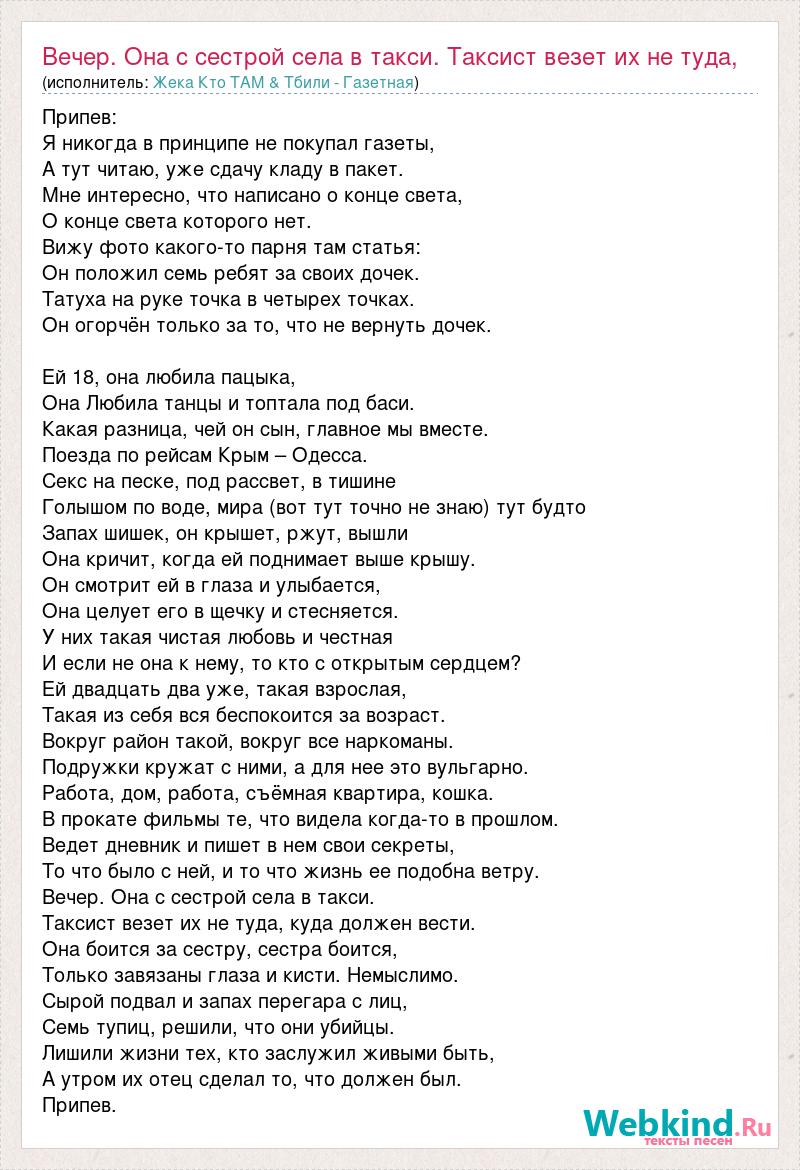 Главная→Исполнители→Жека Кто ТАМ & Тбили - Газетная→Вечер. Она с сестрой села в такси. Таксист везет их не туда, куда должен ве