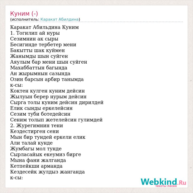 Каракат Абильдина Куним 1. Тогилип ай нуры Сезимнин ак сыры Бесигинде тербетер мени Бакытты шак куймен Жанымды шын суйген Аяулым бар мени шын суйген Махаббаттын багында Ан жырымнын сазында Озин барсын арбир танымда к-сы: Коктен кулген куним дейсин Жылуын берер нурым дейсин Сырга толы куним дейсин дирилдей Елик сынды еркелейсин Сезим туби ботедейсин Сеним толып жетелейсин гулимдей 2. Журегимнин тени Кездестирген сени Мын бир тундей еркели елик Али талай кунде Жумбагы мол тунде Сырласайык екеумиз бирге Мына фани жалганда Кетпейкши арманда Кездесейк жулдыз жанганда к-сы: