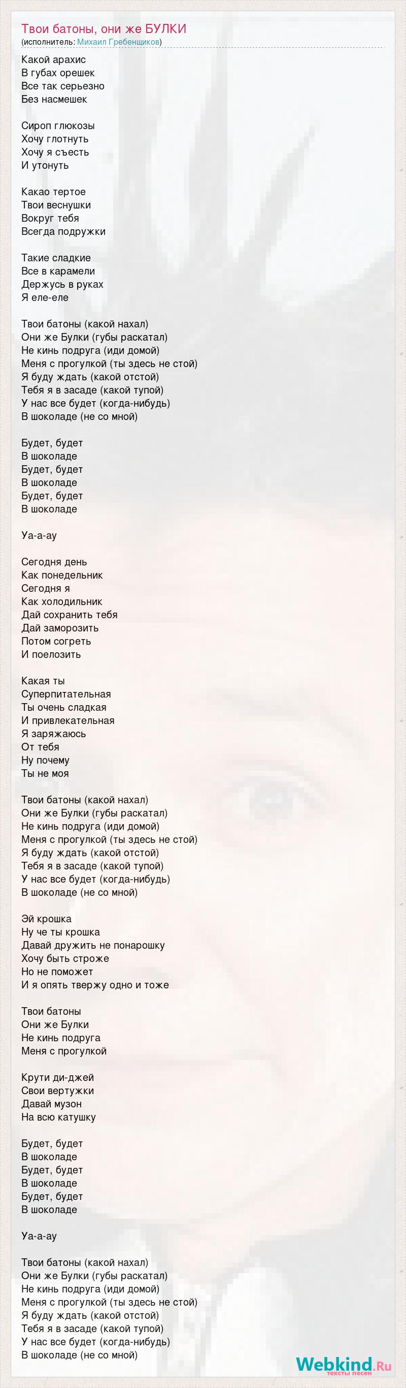 Какой арахис В губах орешек Все так серьезно Без насмешек Сироп глюкозы Хочу глотнуть Хочу я съесть И утонуть Какао тертое Твои веснушки Вокруг тебя Всегда подружки Такие сладкие Все в карамели Держусь в руках Я еле-еле Твои батоны (какой нахал) Они же Булки (губы раскатал) Не кинь подруга (иди домой) Меня с прогулкой (ты здесь не стой) Я буду ждать (какой отстой) Тебя я в засаде (какой тупой) У нас все будет (когда-нибудь) В шоколаде (не со мной) Будет, будет В шоколаде Будет, будет В шоколаде Будет, будет В шоколаде Уа-а-ау Сегодня день Как понедельник Сегодня я Как холодильник Дай сохранить тебя Дай заморозить Потом согреть И поелозить Какая ты Суперпитательная Ты очень сладкая И привлекательная Я заряжаюсь От тебя Ну почему Ты не моя Твои батоны (какой нахал) Они же Булки (губы раскатал) Не кинь подруга (иди домой) Меня с прогулкой (ты здесь не стой) Я буду ждать (какой отстой) Тебя я в засаде (какой тупой) У нас все будет (когда-нибудь) В шоколаде (не со мной) Эй крошка Ну че ты крошка Давай дружить не понарошку Хочу быть строже Но не поможет И я опять твержу одно и тоже Твои батоны Они же Булки Не кинь подруга Меня с прогулкой Крути ди-джей Свои вертужки Давай музон На всю катушку Будет, будет В шоколаде Будет, будет В шоколаде Будет, будет В шоколаде Уа-а-ау Твои батоны (какой нахал) Они же Булки (губы раскатал) Не кинь подруга (иди домой) Меня с прогулкой (ты здесь не стой) Я буду ждать (какой отстой) Тебя я в засаде (какой тупой) У нас все будет (когда-нибудь) В шоколаде (не со мной)