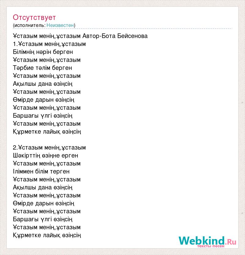 Ұстазым менің,ұстазым Автор-Бота Бейсенова 1.Ұстазым менің,ұстазым Білімнің нәрін берген Ұстазым менің,ұстазым Тәрбие тәлім берген Ұстазым менің,ұстазым Ақылшы дана өзіңсің Ұстазым менің,ұстазым Өмірде дарын өзіңсің Ұстазым менің,ұстазым Баршағы үлгі өзіңсің Ұстазым менің,ұстазым Құрметке лайық өзіңсің 2.Ұстазым менің,ұстазым Шәкірттің өзіңне ерген Ұстазым менің,ұстазым Іліммен білім терген Ұстазым менің,ұстазым Ақылшы дана өзіңсің Ұстазым менің,ұстазым Өмірде дарын өзіңсің Ұстазым менің,ұстазым Баршағы үлгі өзіңсің Ұстазым менің,ұстазым Құрметке лайық өзіңсің