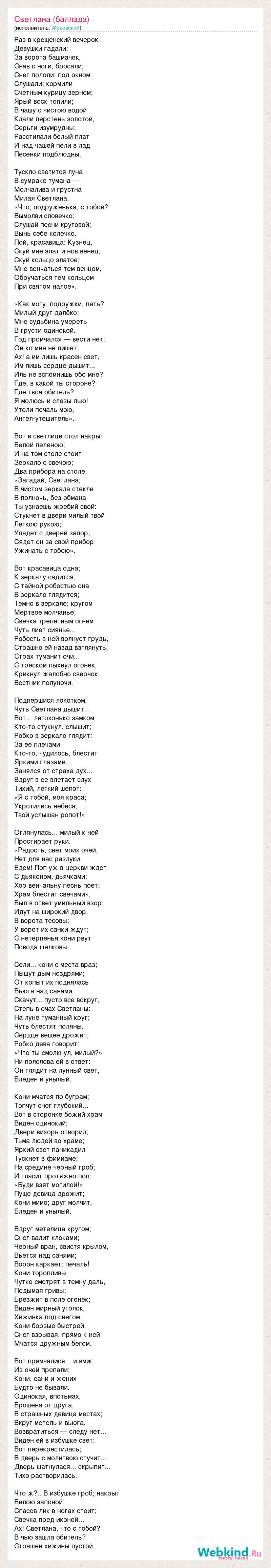 Раз в крещенский вечерок Девушки гадали: За ворота башмачок, Сняв с ноги, бросали; Снег пололи; под окном Слушали; кормили Счетным курицу зерном; Ярый воск топили; В чашу с чистою водой Клали перстень золотой, Серьги изумрудны; Расстилали белый плат И над чашей пели в лад Песенки подблюдны. Тускло светится луна В сумраке тумана — Молчалива и грустна Милая Светлана. «Что, подруженька, с тобой? Вымолви словечко; Слушай песни круговой; Вынь себе колечко. Пой, красавица: Кузнец, Скуй мне злат и нов венец, Скуй кольцо златое; Мне венчаться тем венцом, Обручаться тем кольцом При святом налое». «Как могу, подружки, петь? Милый друг далёко; Мне судьбина умереть В грусти одинокой. Год промчался — вести нет; Он ко мне не пишет; Ах! а им лишь красен свет, Им лишь сердце дышит... Иль не вспомнишь обо мне? Где, в какой ты стороне? Где твоя обитель? Я молюсь и слезы лью! Утоли печаль мою, Ангел-утешитель». Вот в светлице стол накрыт Белой пеленою; И на том столе стоит Зеркало с свечою; Два прибора на столе. «Загадай, Светлана; В чистом зеркала стекле В полночь, без обмана Ты узнаешь жребий свой: Стукнет в двери милый твой Легкою рукою; Упадет с дверей запор; Сядет он за свой прибор Ужинать с тобою». Вот красавица одна; К зеркалу садится; С тайной робостью она В зеркало глядится; Темно в зеркале; кругом Мертвое молчанье; Свечка трепетным огнем Чуть лиет сиянье... Робость в ней волнует грудь, Страшно ей назад взглянуть, Страх туманит очи... С треском пыхнул огонек, Крикнул жалобно сверчок, Вестник полуночи. Подпершися локотком, Чуть Светлана дышит... Вот... легохонько замком Кто-то стукнул, слышит; Робко в зеркало глядит: За ее плечами Кто-то, чудилось, блестит Яркими глазами... Занялся от страха дух... Вдруг в ее влетает слух Тихий, легкий шепот: «Я с тобой, моя краса; Укротились небеса; Твой услышан ропот!» Оглянулась... милый к ней Простирает руки. «Радость, свет моих очей, Нет для нас разлуки. Едем! Поп уж в церкви ждет С дьяконом, дьячками; Хор венчальну песнь поет; Храм блестит свечами». Был в ответ умильный взор; Идут на широкий двор, В ворота тесовы; У ворот их санки ждут; С нетерпенья кони рвут Повода шелковы. Сели... кони с места враз; Пышут дым ноздрями; От копыт их поднялась Вьюга над санями. Скачут... пусто все вокруг, Степь в очах Светланы: На луне туманный круг; Чуть блестят поляны. Сердце вещее дрожит; Робко дева говорит: «Что ты смолкнул, милый?» Ни полслова ей в ответ: Он глядит на лунный свет, Бледен и унылый. Кони мчатся по буграм; Топчут снег глубокий... Вот в сторонке божий храм Виден одинокий; Двери вихорь отворил; Тьма людей во храме; Яркий свет паникадил Тускнет в фимиаме; На средине черный гроб; И гласит протяжно поп: «Буди взят могилой!» Пуще девица дрожит; Кони мимо; друг молчит, Бледен и унылый. Вдруг метелица кругом; Снег валит клоками; Черный вран, свистя крылом, Вьется над санями; Ворон каркает: печаль! Кони торопливы Чутко смотрят в темну даль, Подымая гривы; Брезжит в поле огонек; Виден мирный уголок, Хижинка под снегом. Кони борзые быстрей, Снег взрывая, прямо к ней Мчатся дружным бегом. Вот примчалися... и вмиг Из очей пропали: Кони, сани и жених Будто не бывали. Одинокая, впотьмах, Брошена от друга, В страшных девица местах; Вкруг метель и вьюга. Возвратиться — следу нет... Виден ей в избушке свет: Вот перекрестилась; В дверь с молитвою стучит... Дверь шатнулася... скрыпит... Тих