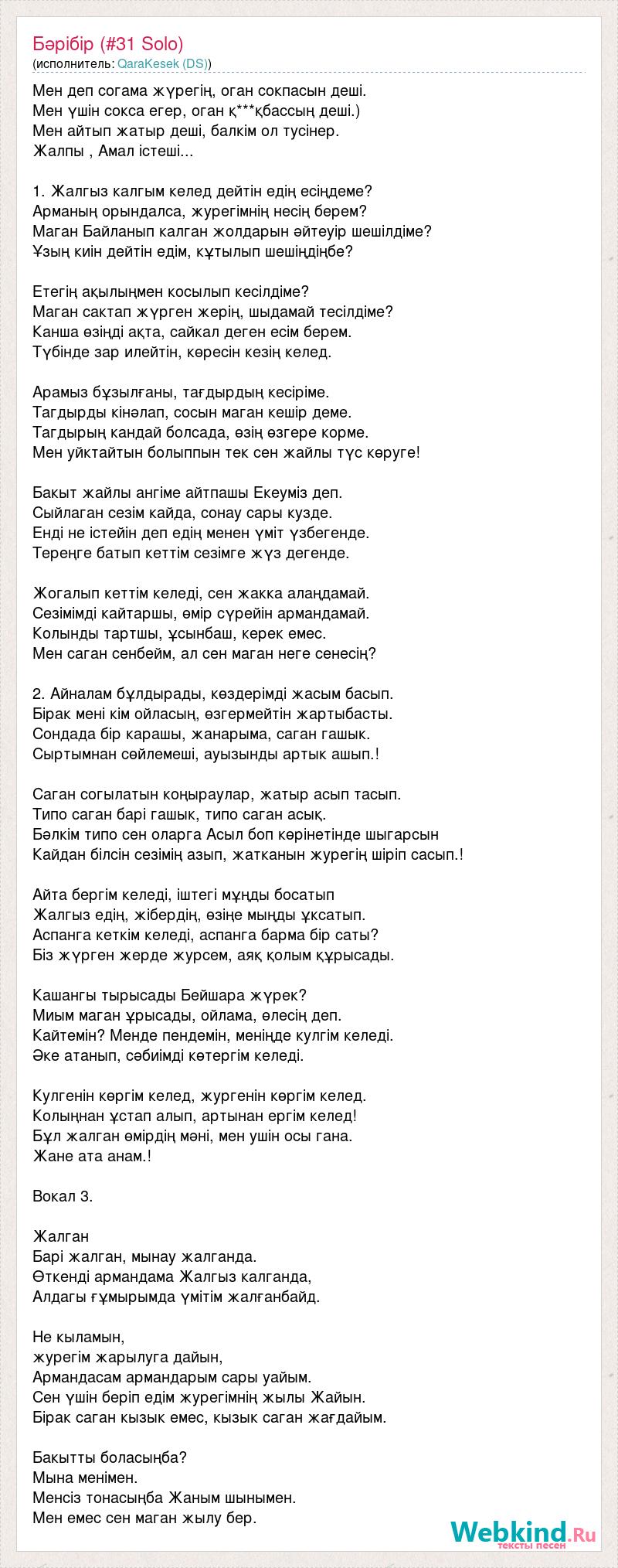 Мен деп согама жүрегің, оган сокпасын деші. Мен үшін сокса егер, оган қ***қбассың деші.) Мен айтып жатыр деші, балкім ол тусінер. Жалпы , Амал істеші... 1. Жалгыз калгым келед дейтін едің есіңдеме? Арманың орындалса, журегімнің несің берем? Маган Байланып калган жолдарын әйтеуір шешілдіме? Ұзың киін дейтін едім, кұтылып шешіңдіңбе? Етегің ақылыңмен косылып кесілдіме? Маган сактап жүрген жерің, шыдамай тесілдіме? Канша өзіңді ақта, сайкал деген есім берем. Түбінде зар илейтін, көресін кезің келед. Арамыз бұзылғаны, тағдырдың кесіріме. Тагдырды кінәлап, сосын маган кешір деме. Тагдырың кандай болсада, өзің өзгере корме. Мен уйктайтын болыппын тек сен жайлы түс көруге! Бакыт жайлы ангіме айтпашы Екеуміз деп. Сыйлаган сезім кайда, сонау сары кузде. Енді не істейін деп едің менен үміт үзбегенде. Тереңге батып кеттім сезімге жүз дегенде. Жогалып кеттім келеді, сен жакка алаңдамай. Сезімімді кайтаршы, өмір сүрейін армандамай. Колынды тартшы, ұсынбаш, керек емес. Мен саган сенбейм, ал сен маган неге сенесің? 2. Айналам бұлдырады, көздерімді жасым басып. Бірак мені кім ойласың, өзгермейтін жартыбасты. Сондада бір карашы, жанарыма, саган гашык. Сыртымнан сөйлемеші, ауызынды артык ашып.! Саган согылатын коңыраулар, жатыр асып тасып. Типо саган барі гашык, типо саган асық. Бәлкім типо сен оларга Асыл боп көрінетінде шыгарсын Кайдан білсін сезімің азып, жатканын журегің шіріп сасып.! Айта бергім келеді, іштегі мұңды босатып Жалгыз едің, жібердің, өзіңе мыңды ұксатып. Аспанга кеткім келеді, аспанга барма бір саты? Біз жүрген жерде журсем, аяқ қолым құрысады. Кашангы тырысады Бейшара жүрек? Миым маган ұрысады, ойлама, өлесің деп. Кайтемін? Менде пендемін, меніңде кулгім келеді. Әке атанып, сәбиімді көтергім келеді. Кулгенін көргім келед, жургенін көргім келед. Колыңнан ұстап алып, артынан ергім келед! Бұл жалган өмірдің мәні, мен ушін осы гана. Жане ата анам.! Вокал 3. Жалган Барі жалган, мынау жалганда. Өткенді армандама Жалгыз калганда, Алдагы ғұмырымда үмітім жалғанбайд. Не кыламын, журегім жарылуга дайын, Армандасам армандарым сары уайым. Сен үшін беріп едім журегімнің жылы Жайын. Бірак саган кызык емес, кызык саган жағдайым. Бакытты боласыңба? Мына менімен. Менсіз тонасыңба Жаным шынымен. Мен емес сен маган жылу бер.