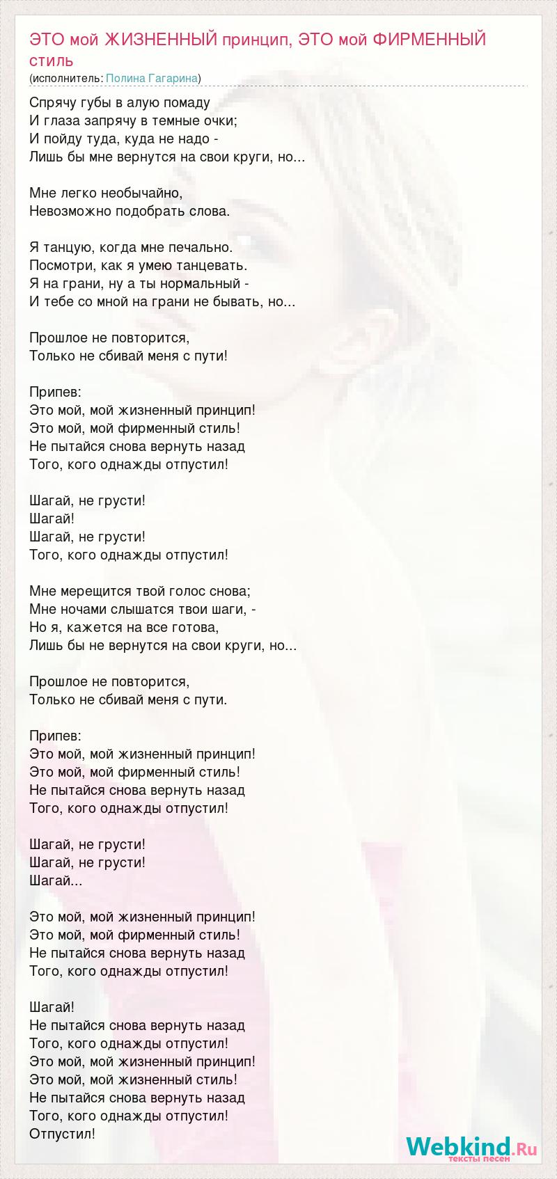Спрячу губы в алую помаду И глаза запрячу в темные очки; И пойду туда, куда не надо - Лишь бы мне вернутся на свои круги, но... Мне легко необычайно, Невозможно подобрать слова. Я танцую, когда мне печально. Посмотри, как я умею танцевать. Я на грани, ну а ты нормальный - И тебе со мной на грани не бывать, но... Прошлое не повторится, Только не сбивай меня с пути! Припев: Это мой, мой жизненный принцип! Это мой, мой фирменный стиль! Не пытайся снова вернуть назад Того, кого однажды отпустил! Шагай, не грусти! Шагай! Шагай, не грусти! Того, кого однажды отпустил! Мне мерещится твой голос снова; Мне ночами слышатся твои шаги, - Но я, кажется на все готова, Лишь бы не вернутся на свои круги, но... Прошлое не повторится, Только не сбивай меня с пути. Припев: Это мой, мой жизненный принцип! Это мой, мой фирменный стиль! Не пытайся снова вернуть назад Того, кого однажды отпустил! Шагай, не грусти! Шагай, не грусти! Шагай... Это мой, мой жизненный принцип! Это мой, мой фирменный стиль! Не пытайся снова вернуть назад Того, кого однажды отпустил! Шагай! Не пытайся снова вернуть назад Того, кого однажды отпустил! Это мой, мой жизненный принцип! Это мой, мой жизненный стиль! Не пытайся снова вернуть назад Того, кого однажды отпустил! Отпустил!
