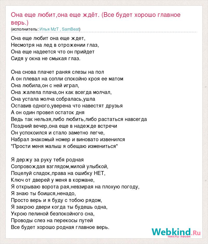 А как ты думаешь, о чем песня "Она еще любит,она еще ждёт. (Все будет хорошо главное верь.)" ?