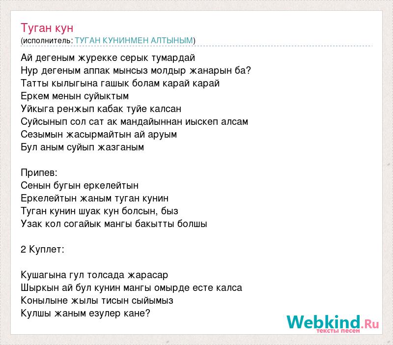 Ай дегеным журекке серык тумардай Нур дегеным аппак мынсыз молдыр жанарын ба? Татты кылыгына гашык болам карай карай Еркем менын суйыктым Уйкыга ренжып кабак туйе калсан Суйсынып сол сат ак мандайыннан иыскеп алсам Сезымын жасырмайтын ай аруым Бул аным суйып жазганым Припев: Сенын бугын еркелейтын Еркелейтын жаным туган кунин Туган кунин шуак кун болсын, быз Узак кол согайык мангы бакытты болшы 2 Куплет: Кушагына гул толсада жарасар Шыркын ай бул кунин мангы омырде есте калса Конылыне жылы тисын сыйымыз Кулшы жаным езулер кане?