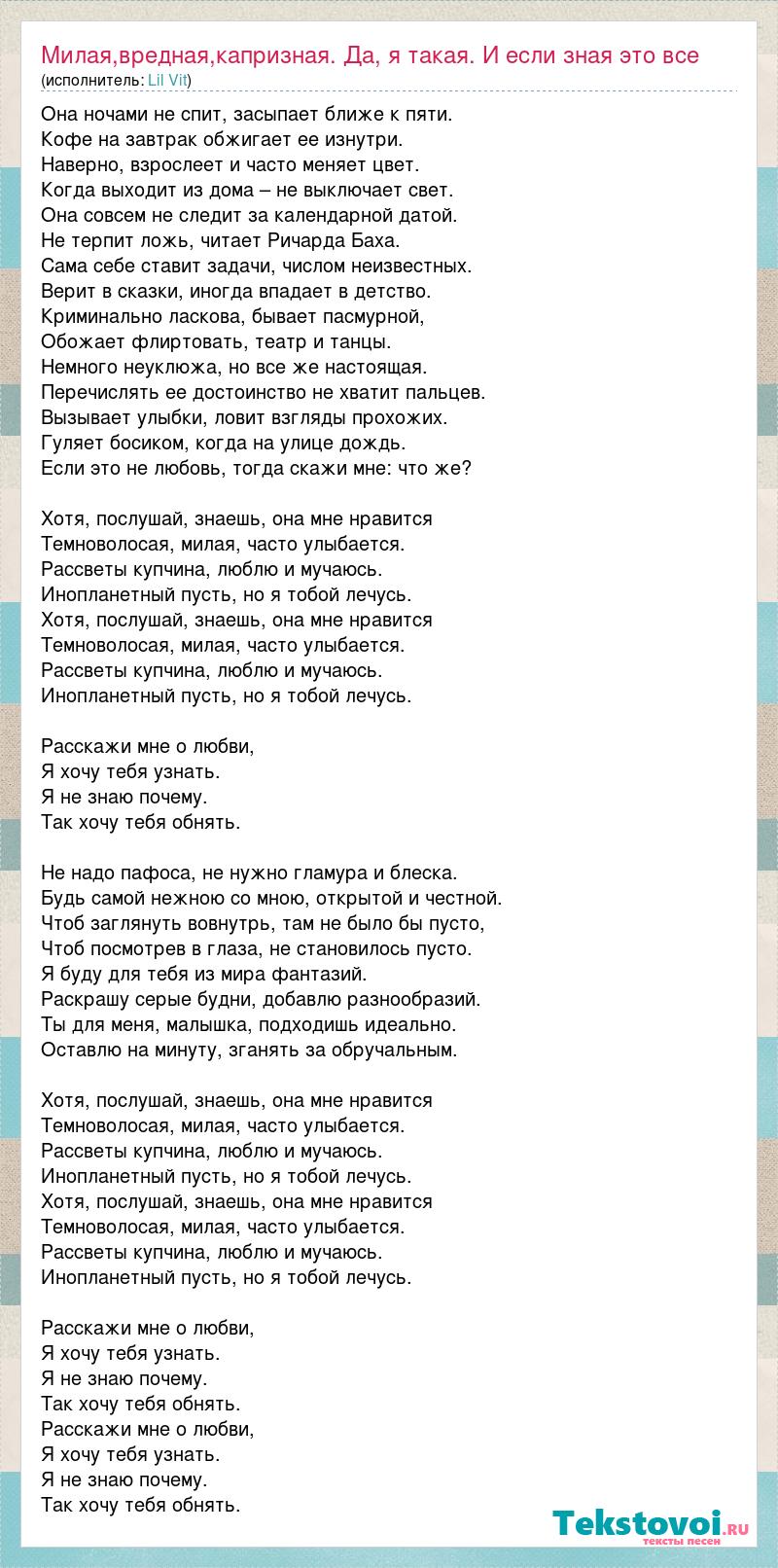Она ночами не спит, засыпает ближе к пяти. Кофе на завтрак обжигает ее изнутри. Наверно, взрослеет и часто меняет цвет. Когда выходит из дома – не выключает свет. Она совсем не следит за календарной датой. Не терпит ложь, читает Ричарда Баха. Сама себе ставит задачи, числом неизвестных. Верит в сказки, иногда впадает в детство. Криминально ласкова, бывает пасмурной, Обожает флиртовать, театр и танцы. Немного неуклюжа, но все же настоящая. Перечислять ее достоинство не хватит пальцев. Вызывает улыбки, ловит взгляды прохожих. Гуляет босиком, когда на улице дождь. Если это не любовь, тогда скажи мне: что же? Хотя, послушай, знаешь, она мне нравится Темноволосая, милая, часто улыбается. Рассветы купчина, люблю и мучаюсь. Инопланетный пусть, но я тобой лечусь. Хотя, послушай, знаешь, она мне нравится Темноволосая, милая, часто улыбается. Рассветы купчина, люблю и мучаюсь. Инопланетный пусть, но я тобой лечусь. Расскажи мне о любви, Я хочу тебя узнать. Я не знаю почему. Так хочу тебя обнять. Не надо пафоса, не нужно гламура и блеска. Будь самой нежною со мною, открытой и честной. Чтоб заглянуть вовнутрь, там не было бы пусто, Чтоб посмотрев в глаза, не становилось пусто. Я буду для тебя из мира фантазий. Раскрашу серые будни, добавлю разнообразий. Ты для меня, малышка, подходишь идеально. Оставлю на минуту, зганять за обручальным. Хотя, послушай, знаешь, она мне нравится Темноволосая, милая, часто улыбается. Рассветы купчина, люблю и мучаюсь. Инопланетный пусть, но я тобой лечусь. Хотя, послушай, знаешь, она мне нравится Темноволосая, милая, часто улыбается. Рассветы купчина, люблю и мучаюсь. Инопланетный пусть, но я тобой лечусь. Расскажи мне о любви, Я хочу тебя узнать. Я не знаю почему. Так хочу тебя обнять. Расскажи мне о любви, Я хочу тебя узнать. Я не знаю почему. Так хочу тебя обнять.