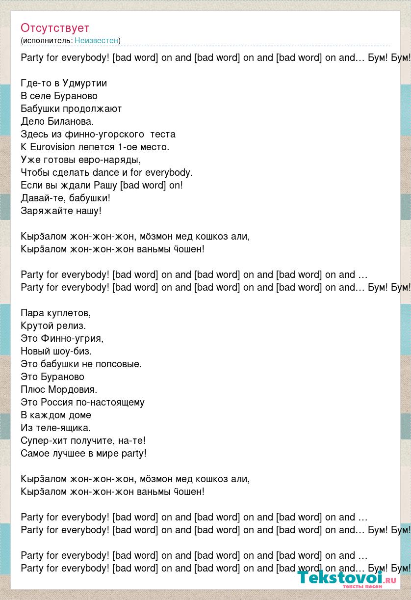 Party for everybody! Dance! Come on and dance! Come on and dance! Come on and… Бум! Бум! Где-то в Удмуртии В селе Бураново Бабушки продолжают Дело Биланова. Здесь из финно-угорского теста К Eurovision лепется 1-ое место. Уже готовы евро-наряды, Чтобы сделать dance и for everybody. Если вы ждали Рашу - come on! Давай-те, бабушки! Заряжайте нашу! Кырӟалом жон-жон-жон, мӧзмон мед кошкоз али, Кырӟалом жон-жон-жон ваньмы ӵошен! Party for everybody! Dance! Come on and dance! Come on and dance! Come on and … Party for everybody! Dance! Come on and dance! Come on and dance! Come on and… Бум! Бум! Пара куплетов, Крутой релиз. Это Финно-угрия, Новый шоу-биз. Это бабушки не попсовые. Это Бураново Плюс Мордовия. Это Россия по-настоящему В каждом доме Из теле-ящика. Супер-хит получите, на-те! Самое лучшее в мире party! Кырӟалом жон-жон-жон, мӧзмон мед кошкоз али, Кырӟалом жон-жон-жон ваньмы ӵошен! Party for everybody! Dance! Come on and dance! Come on and dance! Come on and … Party for everybody! Dance! Come on and dance! Come on and dance! Come on and… Бум! Бум! Party for everybody! Dance! Come on and dance! Come on and dance! Come on and … Party for everybody! Dance! Come on and dance! Come on and dance! Come on and… Бум! Бум!
