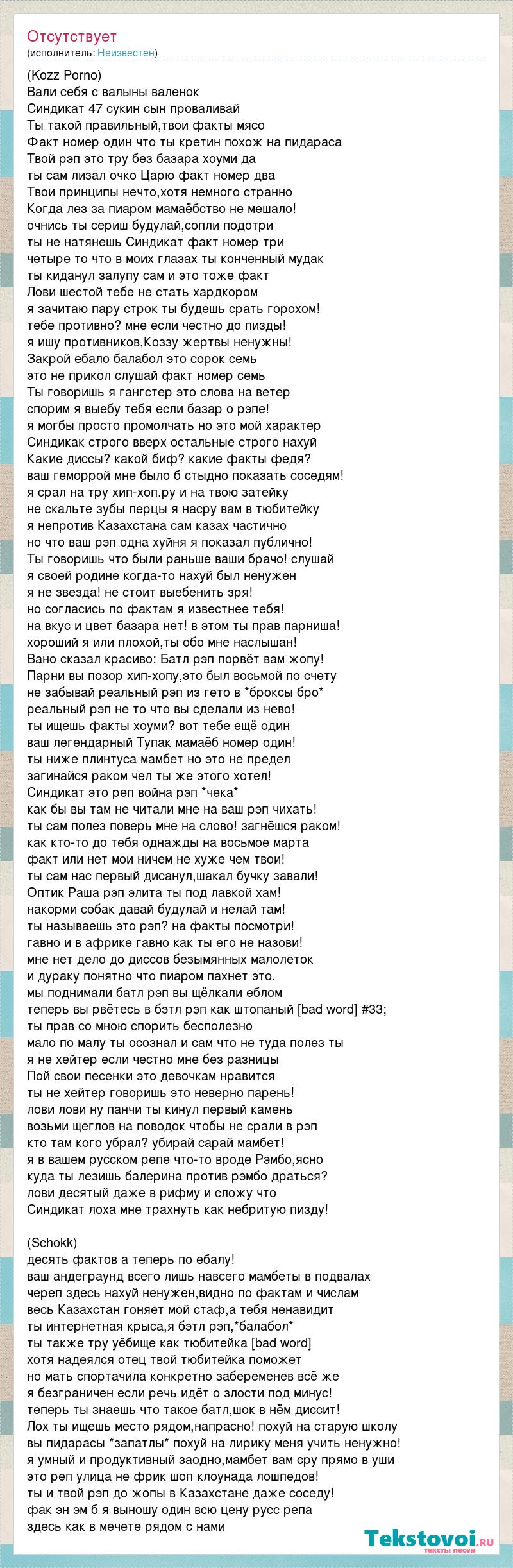 (Kozz Porno) Вали себя с валыны валенок Синдикат 47 сукин сын проваливай Ты такой правильный,твои факты мясо Факт номер один что ты кретин похож на пидараса Твой рэп это тру без базара хоуми да ты сам лизал очко Царю факт номер два Твои принципы нечто,хотя немного странно Когда лез за пиаром мамаёбство не мешало! очнись ты сериш будулай,сопли подотри ты не натянешь Синдикат факт номер три четыре то что в моих глазах ты конченный мудак ты киданул залупу сам и это тоже факт Лови шестой тебе не стать хардкором я зачитаю пару строк ты будешь срать горохом! тебе противно? мне если честно до пизды! я ишу противников,Коззу жертвы ненужны! Закрой ебало балабол это сорок семь это не прикол слушай факт номер семь Ты говоришь я гангстер это слова на ветер спорим я выебу тебя если базар о рэпе! я могбы просто промолчать но это мой характер Синдикак строго вверх остальные строго нахуй Какие диссы? какой биф? какие факты федя? ваш геморрой мне было б стыдно показать соседям! я срал на тру хип-хоп.ру и на твою затейку не скальте зубы перцы я насру вам в тюбитейку я непротив Казахстана сам казах частично но что ваш рэп одна хуйня я показал публично! Ты говоришь что были раньше ваши брачо! слушай я своей родине когда-то нахуй был ненужен я не звезда! не стоит выебенить зря! но согласись по фактам я известнее тебя! на вкус и цвет базара нет! в этом ты прав парниша! хороший я или плохой,ты обо мне наслышан! Вано сказал красиво: Батл рэп порвёт вам жопу! Парни вы позор хип-хопу,это был восьмой по счету не забывай реальный рэп из гето в *броксы бро* реальный рэп не то что вы сделали из нево! ты ищешь факты хоуми? вот тебе ещё один ваш легендарный Тупак мамаёб номер один! ты ниже плинтуса мамбет но это не предел загинайся раком чел ты же этого хотел! Синдикат это реп война рэп *чека* как бы вы там не читали мне на ваш рэп чихать! ты сам полез поверь мне на слово! загнёшся раком! как кто-то до тебя однажды на восьмое марта факт или нет мои ничем не хуже чем твои! ты сам нас первый дисанул,шакал бучку завали! Оптик Раша рэп элита ты под лавкой хам! накорми собак давай будулай и нелай там! ты называешь это рэп? на факты посмотри! гавно и в африке гавно как ты его не назови! мне нет дело до диссов безымянных малолеток и дураку понятно что пиаром пахнет это. мы поднимали батл рэп вы щёлкали еблом теперь вы рвётесь в бэтл рэп как штопаный [bad word] #33; ты прав со мною спорить бесполезно мало по малу ты осознал и сам что не туда полез ты я не хейтер если честно мне без разницы Пой свои песенки это девочкам нравится ты не хейтер говоришь это неверно парень! лови лови ну панчи ты кинул первый камень возьми щеглов на поводок чтобы не срали в рэп кто там кого убрал? убирай сарай мамбет! я в вашем русском репе что-то вроде Рэмбо,ясно куда ты лезишь балерина против рэмбо драться? лови десятый даже в рифму и сложу что Синдикат лоха мне трахнуть как небритую пизду! (Schokk) десять фактов а теперь по ебалу! ваш андеграунд всего лишь навсего мамбеты в подвалах череп здесь нахуй ненужен,видно по фактам и числам весь Казахстан гоняет мой стаф,а тебя ненавидит ты интернетная крыса,я бэтл рэп,*балабол* ты также тру уёбище как тюбитейка [bad word] хотя надеялся отец твой тюбитейка поможет но мать спортачила конкретно забеременев всё же я безграничен если речь идёт о злости под минус! теперь ты знаешь что такое батл,шок в нём дисси