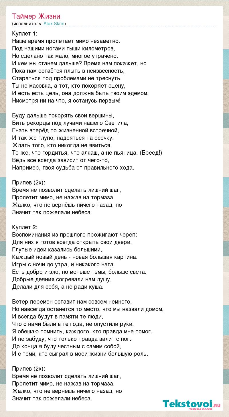 Куплет 1: Наше время пролетает мимо незаметно. Под нашими ногами тыщи километров, Но сделано так мало, многое утрачено. И кем мы станем дальше? Время нам покажет, но Пока нам остаётся плыть в неизвесность, Стараться под проблемами не треснуть. Ты не масовка, а тот, кто покоряет сцену, И есть есть цель, она должна быть твоим эдемом. Нисмотря ни на что, я останусь первым! Буду дальше покорять свои вершины, Бить рекорды под лучами нашего Светила, Гнать вперёд по жизненной встречной, И так же глупо, надеяться на осечку. Ждать того, кто никогда не явиться, То же, что гордитья, что алкаш, а не пьяница. (Бреед!) Ведь всё всегда зависит от чего-то, Например, твоя судьба от правильного хода. Припев (2х): Время не позволит сделать лишний шаг, Пролетит мимо, не нажав на тормаза. Жалко, что не вернёшь ничего назад, но Значит так пожелали небеса. Куплет 2: Воспоминания из прошлого прожигают череп: Для них я готов всегда открыть свои двери. Глупые идеи казались большими, Каждый новый день - новая большая картина. Игры с ночи до утра, и никакого нэта. Есть добро и зло, но меньше тьмы, больше света. Добрые деяния согревали нам душу, Делали для себя, а не ради куша. Ветер перемен оставит нам совсем немного, Но навсегда останется то место, что мы назвали домом, И всегда будут в памяти те люди, Что с нами были в те года, не опустили руки. Я обещаю помнить, каждого, кто правда мне помог, И не забуду, что только правда валит с ног. До конца я буду честным с самим собой, И с теми, кто сыграл в моей жизни большую роль. Припев (2х): Время не позволит сделать лишний шаг, Пролетит мимо, не нажав на тормаза. Жалко, что не вернёшь ничего назад, но Значит так пожелали небеса.