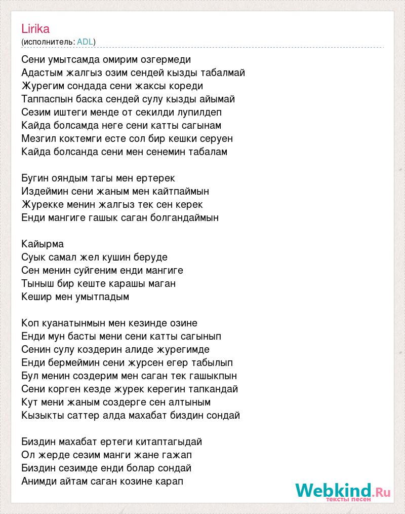Сени умытсамда омирим озгермеди Адастым жалгыз озим сендей кызды табалмай Журегим сондада сени жаксы кореди Таппаспын баска сендей сулу кызды айымай Сезим иштеги менде от секилди лупилдеп Кайда болсамда неге сени катты сагынам Мезгил коктемги есте сол бир кешки серуен Кайда болсанда сени мен сенемин табалам Бугин ояндым тагы мен ертерек Издеймин сени жаным мен кайтпаймын Журекке менин жалгыз тек сен керек Енди мангиге гашык саган болгандаймын Кайырма Суык самал жел кушин беруде Сен менин суйгеним енди мангиге Тыныш бир кеште карашы маган Кешир мен умытпадым Коп куанатынмын мен кезинде озине Енди мун басты мени сени катты сагынып Сенин сулу коздерин алиде журегимде Енди бермеймин сени журсен егер табылып Бул менин создерим мен саган тек гашыкпын Сени корген кезде журек керегин тапкандай Кут мени жаным создерге сен алтыным Кызыкты саттер алда махабат биздин сондай Биздин махабат ертеги китаптагыдай Ол жерде сезим манги жане гажап Биздин сезимде енди болар сондай Анимди айтам саган козине карап