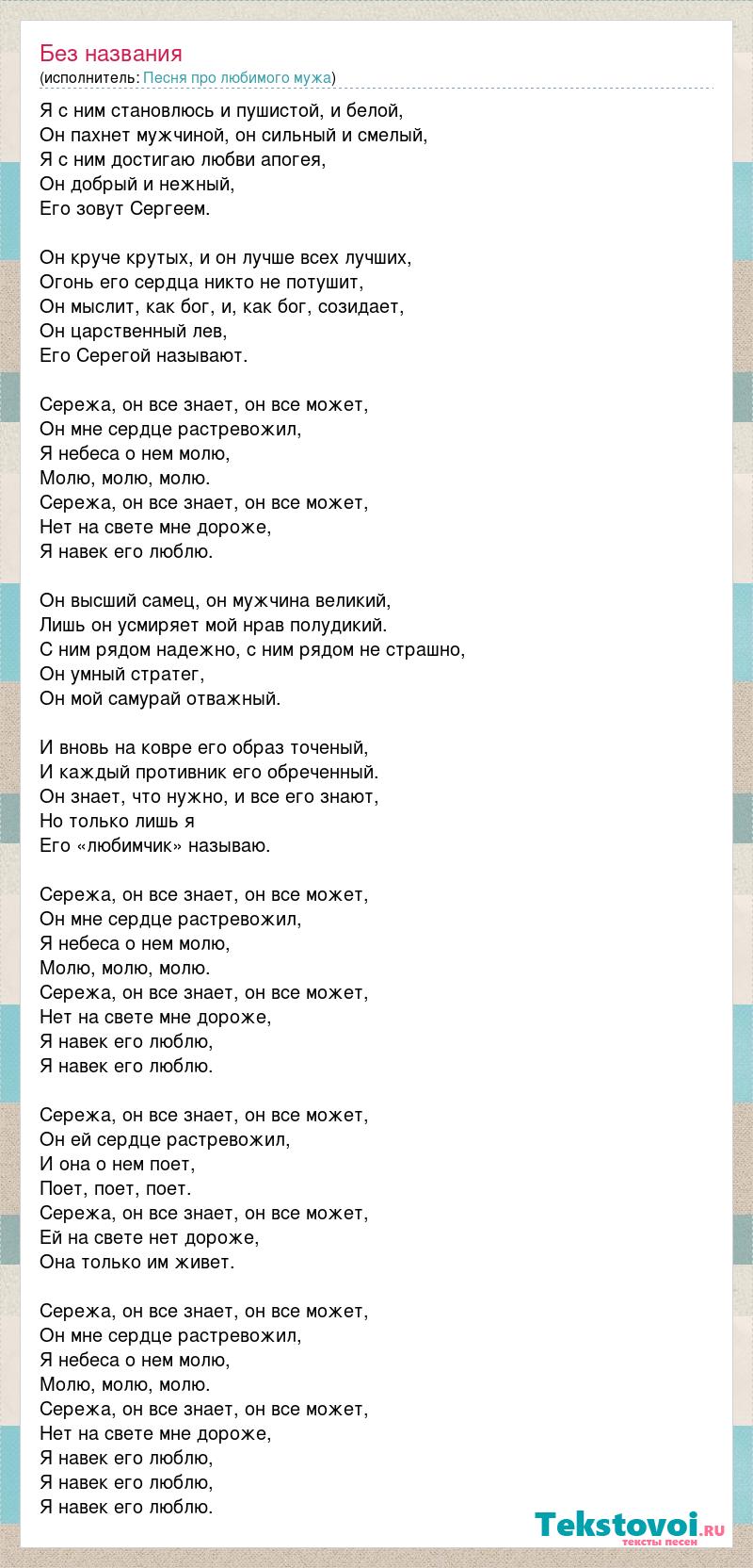 Я с ним становлюсь и пушистой, и белой, Он пахнет мужчиной, он сильный и смелый, Я с ним достигаю любви апогея, Он добрый и нежный, Его зовут Сергеем. Он круче крутых, и он лучше всех лучших, Огонь его сердца никто не потушит, Он мыслит, как бог, и, как бог, созидает, Он царственный лев, Его Серегой называют. Сережа, он все знает, он все может, Он мне сердце растревожил, Я небеса о нем молю, Молю, молю, молю. Сережа, он все знает, он все может, Нет на свете мне дороже, Я навек его люблю. Он высший самец, он мужчина великий, Лишь он усмиряет мой нрав полудикий. С ним рядом надежно, с ним рядом не страшно, Он умный стратег, Он мой самурай отважный. И вновь на ковре его образ точеный, И каждый противник его обреченный. Он знает, что нужно, и все его знают, Но только лишь я Его «любимчик» называю. Сережа, он все знает, он все может, Он мне сердце растревожил, Я небеса о нем молю, Молю, молю, молю. Сережа, он все знает, он все может, Нет на свете мне дороже, Я навек его люблю, Я навек его люблю. Сережа, он все знает, он все может, Он ей сердце растревожил, И она о нем поет, Поет, поет, поет. Сережа, он все знает, он все может, Ей на свете нет дороже, Она только им живет. Сережа, он все знает, он все может, Он мне сердце растревожил, Я небеса о нем молю, Молю, молю, молю. Сережа, он все знает, он все может, Нет на свете мне дороже, Я навек его люблю, Я навек его люблю, Я навек его люблю.