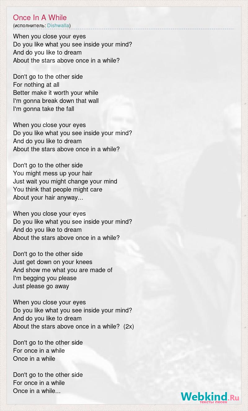 When you close your eyes Do you like what you see inside your mind? And do you like to dream About the stars above once in a while? Don't go to the other side For nothing at all Better make it worth your while I'm gonna break down that wall I'm gonna take the fall When you close your eyes Do you like what you see inside your mind? And do you like to dream About the stars above once in a while? Don't go to the other side You might mess up your hair Just wait you might change your mind You think that people might care About your hair anyway... When you close your eyes Do you like what you see inside your mind? And do you like to dream About the stars above once in a while? Don't go to the other side Just get down on your knees And show me what you are made of I'm begging you please Just please go away When you close your eyes Do you like what you see inside your mind? And do you like to dream About the stars above once in a while? (2x) Don't go to the other side For once in a while Once in a while Don't go to the other side For once in a while Once in a while...