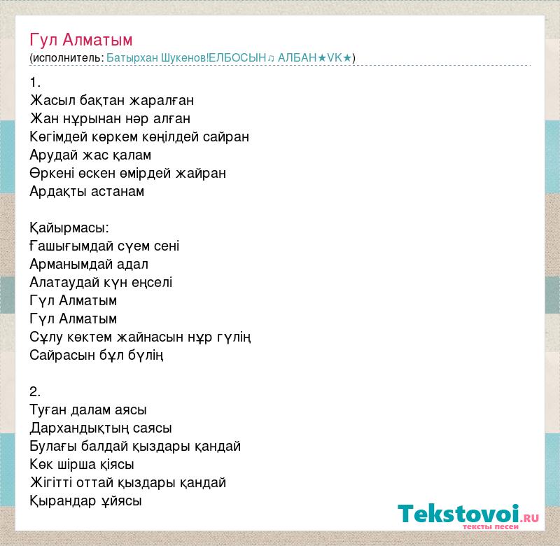 1. Жасыл бақтан жаралған Жан нұрынан нәр алған Көгімдей көркем көңілдей сайран Арудай жас қалам Өркені өскен өмірдей жайран Ардақты астанам Қайырмасы: Ғашығымдай сүем сені Арманымдай адал Алатаудай күн еңселі Гүл Алматым Гүл Алматым Сұлу көктем жайнасын нұр гүлің Сайрасын бұл бүлің 2. Туған далам аясы Дархандықтың саясы Булағы балдай қыздары қандай Көк шірша қіясы Жігітті оттай қыздары қандай Қырандар ұйясы