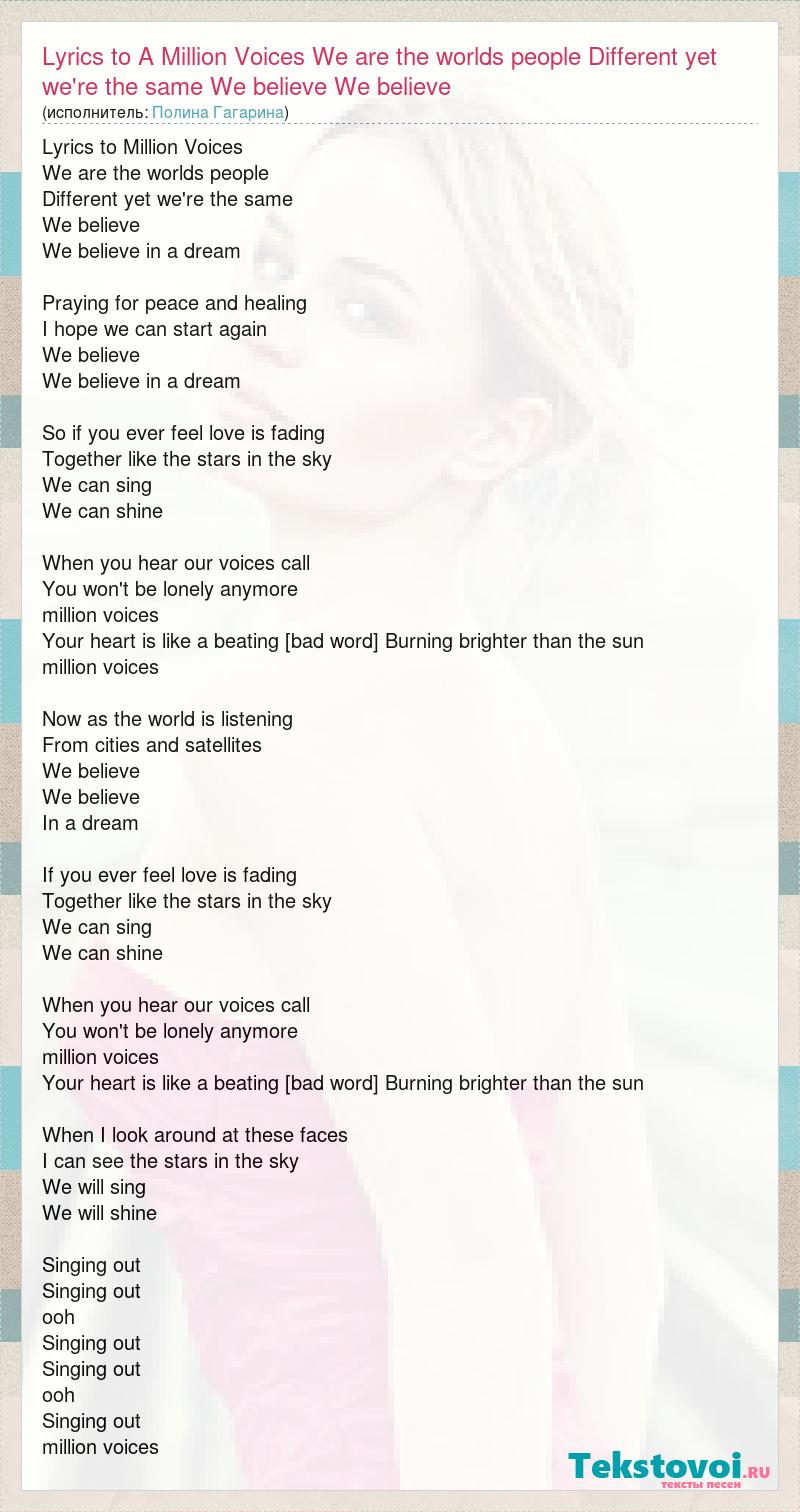 Главная→Исполнители→Полина Гагарина→Lyrics to A Million Voices We are the worlds people Different yet we're
