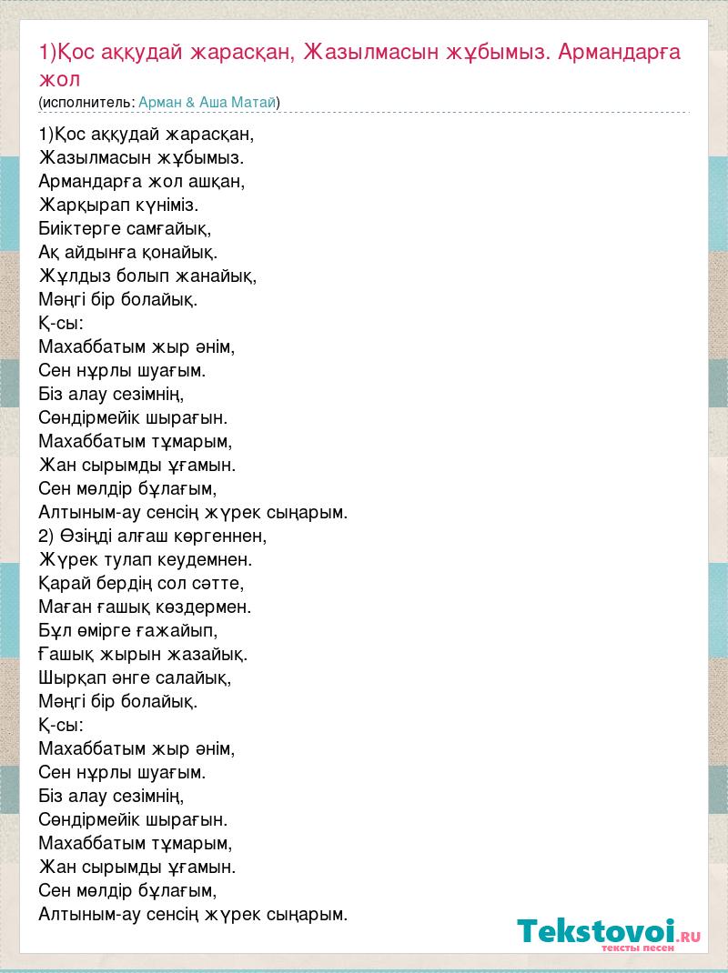 Главная→Исполнители→Арман & Аша Матай→1)Қос аққудай жарасқан, Жазылмасын жұбымыз. Армандарға жол ашқан, Жарқырап күн