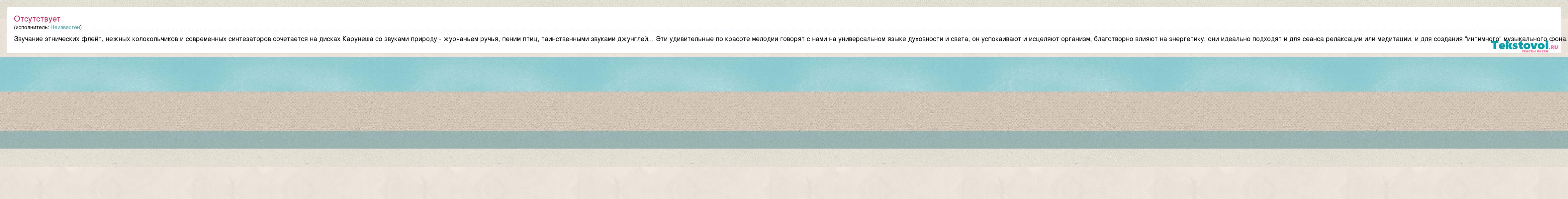 Звучание этнических флейт, нежных колокольчиков и современных синтезаторов сочетается на дисках Карунеша со звуками природу - журчаньем ручья, пеним птиц, таинственными звуками джунглей... Эти удивительные по красоте мелодии говорят с нами на универсальном языке духовности и света, он успокаивают и исцеляют организм, благотворно влияют на энергетику, они идеально подходят и для сеанса релаксации или медитации, и для создания "интимного" музыкального фона.
