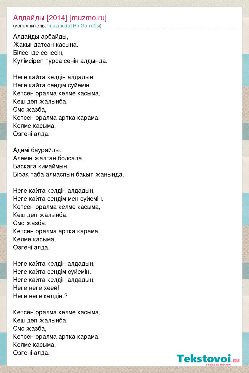 Алдайды арбайды, Жакындатсан касына. Бiлсенде сенесiн, Кулiмсiреп турса сенiн алдында. Неге кайта келдiн алдадын, Неге кайта сендiм суйемiн. Кетсен оралма келме касыма, Кеш деп жалынба. Смс жазба, Кетсен оралма артка карама. Келме касыма, Озгенi алда. Адемi баурайды, Алемiн жалган болсада. Баскага кимаймын, Бiрак таба алмаспын бакыт жанында. Неге кайта келдiн алдадын, Неге кайта сендiм мен суйемiн. Кетсен оралма келме касыма, Кеш деп жалынба. Смс жазба, Кетсен оралма артка карама. Келме касыма, Озгенi алда. Неге кайта келдiн алдадын, Неге кайта сендiм суйемiн. Неге кайта келдiн алдадын, Неге неге хеей! Неге неге келдiн.? Кетсен оралма келме касыма, Кеш деп жалынба. Смс жазба, Кетсен оралма артка карама. Келме касыма, Озгенi алда.