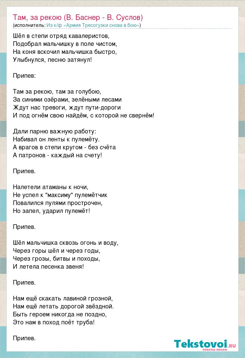 Шёл в степи отряд кавалеристов, Подобрал мальчишку в поле чистом, На коня вскочил мальчишка быстро, Улыбнулся, песню затянул! Припев: Там за рекою, там за голубою, За синими озёрами, зелёными лесами Ждут нас тревоги, ждут пути-дороги И под огнём свою найдём, с которой не свернём! Дали парню важную работу: Набивал он ленты к пулемёту. А врагов в степи кругом - без счёта А патронов - каждый на счету! Припев. Налетели атаманы к ночи, Не успел к "максиму" пулемётчик Повалился пулями прострочен, Но запел, ударил пулемёт! Припев. Шёл мальчишка сквозь огонь и воду, Через горы шёл и через годы, Через грозы, битвы и походы, И летела песенка звеня! Припев. Нам ещё скакать лавиной грозной, Нам ещё летать дорогой звёздной. Быть героем никогда не поздно, Это нам в поход поёт труба! Припев.