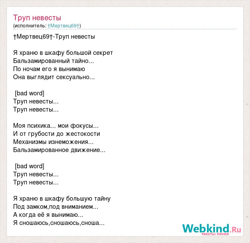 †Мертвец69†-Труп невесты Я храню в шкафу большой секрет Бальзамированный тайно... По ночам его я вынимаю Она выглядит сексуально... [bad word] Труп невесты... Труп невесты... Моя психика... мои фокусы... И от грубости до жестокости Механизмы изнеможения... Бальзамированное движение... [bad word] Труп невесты... Труп невесты... Я храню в шкафу большую тайну Под замком,под вниманием... А когда её я вынимаю... Я сношаюсь,сношаюсь,сноша...