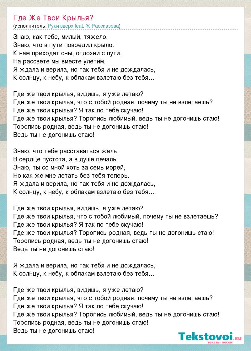 Знаю, как тебе, милый, тяжело. Знаю, что в пути повредил крыло. К нам приходят сны, отдохни с пути, На рассвете мы вместе улетим. Я ждала и верила, но так тебя и не дождалась, К солнцу, к небу, к облакам взлетаю без тебя… Где же твои крылья, видишь, я уже летаю? Где же твои крылья, что с тобой родная, почему ты не взлетаешь? Где же твои крылья? Я так по тебе скучаю! Где же твои крылья? Торопись любимый, ведь ты не догонишь стаю! Торопись родная, ведь ты не догонишь стаю! Ведь ты не догонишь стаю! Знаю, что тебе расставаться жаль, В сердце пустота, а в душе печаль. Знаю, ты со мной хоть за семь морей, Но как же мне летать без тебя теперь. Я ждала и верила, но так тебя и не дождалась, К солнцу, к небу, к облакам взлетаю без тебя… Где же твои крылья, видишь, я уже летаю? Где же твои крылья, что с тобой любимый, почему ты не взлетаешь? Где же твои крылья? Я так по тебе скучаю! Где же твои крылья? Торопись родная, ведь ты не догонишь стаю! Торопись родная, ведь ты не догонишь стаю! Ведь ты не догонишь стаю! Я ждала и верила, но так тебя и не дождалась, К солнцу, к небу, к облакам взлетаю без тебя… Где же твои крылья, видишь, я уже летаю? Где же твои крылья, что с тобой родная, почему ты не взлетаешь? Где же твои крылья? Я так по тебе скучаю! Где же твои крылья? Торопись любимый, ведь ты не догонишь стаю! Торопись родная, ведь ты не догонишь стаю! Ведь ты не догонишь стаю!
