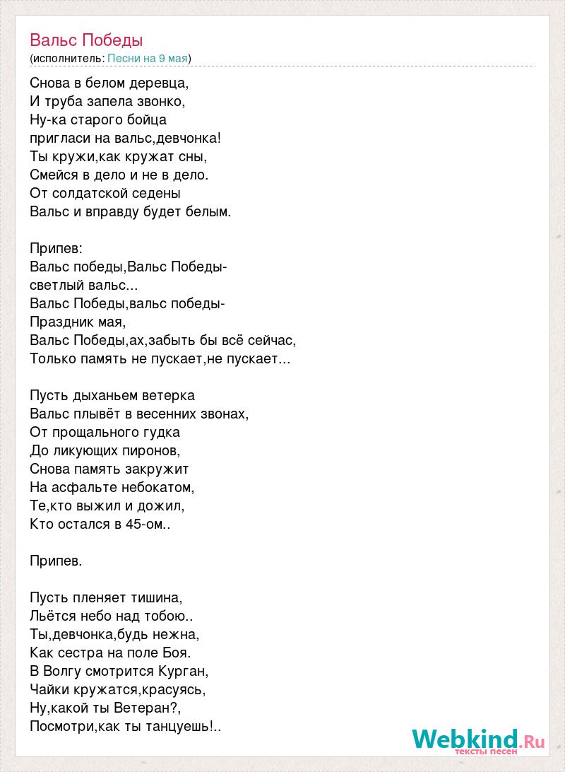 Снова в белом деревца, И труба запела звонко, Ну-ка старого бойца пригласи на вальс,девчонка! Ты кружи,как кружат сны, Смейся в дело и не в дело. От солдатской седены Вальс и вправду будет белым. Припев: Вальс победы,Вальс Победы- светлый вальс... Вальс Победы,вальс победы- Праздник мая, Вальс Победы,ах,забыть бы всё сейчас, Только память не пускает,не пускает... Пусть дыханьем ветерка Вальс плывёт в весенних звонах, От прощального гудка До ликующих пиронов, Снова память закружит На асфальте небокатом, Те,кто выжил и дожил, Кто остался в 45-ом.. Припев. Пусть пленяет тишина, Льётся небо над тобою.. Ты,девчонка,будь нежна, Как сестра на поле Боя. В Волгу смотрится Курган, Чайки кружатся,красуясь, Ну,какой ты Ветеран?, Посмотри,как ты танцуешь!..