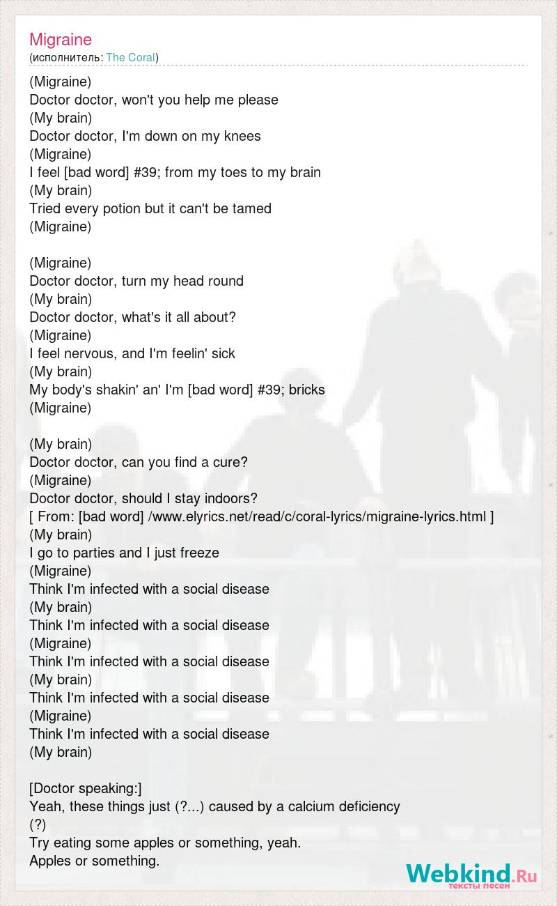 (Migraine) Doctor doctor, won't you help me please (My brain) Doctor doctor, I'm down on my knees (Migraine) I feel [bad word] #39; from my toes to my brain (My brain) Tried every potion but it can't be tamed (Migraine) (Migraine) Doctor doctor, turn my head round (My brain) Doctor doctor, what's it all about? (Migraine) I feel nervous, and I'm feelin' sick (My brain) My body's shakin' an' I'm [bad word] #39; bricks (Migraine) (My brain) Doctor doctor, can you find a cure? (Migraine) Doctor doctor, should I stay indoors? [ From: [bad word] /www.elyrics.net/read/c/coral-lyrics/migraine-lyrics.html ] (My brain) I go to parties and I just freeze (Migraine) Think I'm infected with a social disease (My brain) Think I'm infected with a social disease (Migraine) Think I'm infected with a social disease (My brain) Think I'm infected with a social disease (Migraine) Think I'm infected with a social disease (My brain) [Doctor speaking:] Yeah, these things just (?...) caused by a calcium deficiency (?) Try eating some apples or something, yeah. Apples or something.