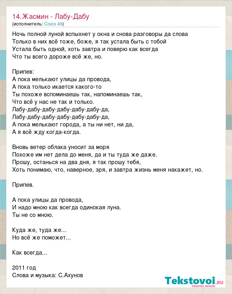 Ночь полной луной вспыхнет у окна и снова разговоры да слова Только в них всё тоже, боже, я так устала быть с тобой Устала быть одной, хоть завтра и поверю как всегда Что ты всего дороже всё же, но. Припев: А пока мелькают улицы да провода, А пока только икается какого-то Ты похоже вспоминаешь так, напоминаешь так, Что всё у нас не так и только. Лабу-дабу-дабу-дабу-дабу-дабу-да, Лабу-дабу-дабу-дабу-дабу-дабу-да, А пока мелькают города, а ты ни нет, ни да, А я всё жду когда-когда. Вновь ветер облака уносит за моря Похоже им нет дела до меня, да и ты туда же даже. Прошу, останься на два дня, я так прошу тебя, Хоть понимаю, что, наверное, зря, и завтра жизнь меня накажет, но. Припев. А пока улицы да провода, И надо мною как всегда одинокая луна. Ты не со мною. Куда же, туда же... Но всё же поможет... Как всегда... 2011 год Слова и музыка: С.Ахунов