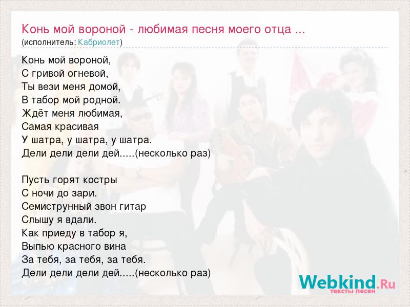 Конь мой вороной, С гривой огневой, Ты вези меня домой, В табор мой родной. Ждёт меня любимая, Самая красивая У шатра, у шатра, у шатра. Дели дели дели дей.....(несколько раз) Пусть горят костры С ночи до зари. Семиструнный звон гитар Слышу я вдали. Как приеду в табор я, Выпью красного вина За тебя, за тебя, за тебя. Дели дели дели дей.....(несколько раз)