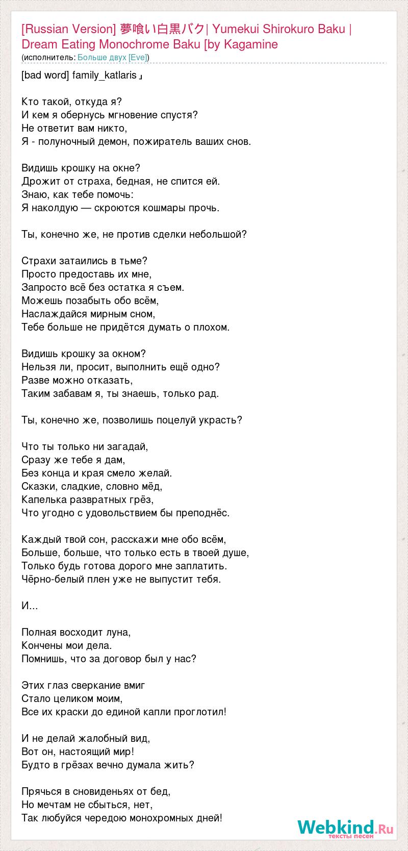 [bad word] family_katlaris」 Кто такой, откуда я? И кем я обернусь мгновение спустя? Не ответит вам никто, Я - полуночный демон, пожиратель ваших снов. Видишь крошку на окне? Дрожит от страха, бедная, не спится ей. Знаю, как тебе помочь: Я наколдую — скроются кошмары прочь. Ты, конечно же, не против сделки небольшой? Страхи затаились в тьме? Просто предоставь их мне, Запросто всё без остатка я съем. Можешь позабыть обо всём, Наслаждайся мирным сном, Тебе больше не придётся думать о плохом. Видишь крошку за окном? Нельзя ли, просит, выполнить ещё одно? Разве можно отказать, Таким забавам я, ты знаешь, только рад. Ты, конечно же, позволишь поцелуй украсть? Что ты только ни загадай, Сразу же тебе я дам, Без конца и края смело желай. Сказки, сладкие, словно мёд, Капелька развратных грёз, Что угодно с удовольствием бы преподнёс. Каждый твой сон, расскажи мне обо всём, Больше, больше, что только есть в твоей душе, Только будь готова дорого мне заплатить. Чёрно-белый плен уже не выпустит тебя. И... Полная восходит луна, Кончены мои дела. Помнишь, что за договор был у нас? Этих глаз сверкание вмиг Стало целиком моим, Все их краски до единой капли проглотил! И не делай жалобный вид, Вот он, настоящий мир! Будто в грёзах вечно думала жить? Прячься в сновиденьях от бед, Но мечтам не сбыться, нет, Так любуйся чередою монохромных дней!