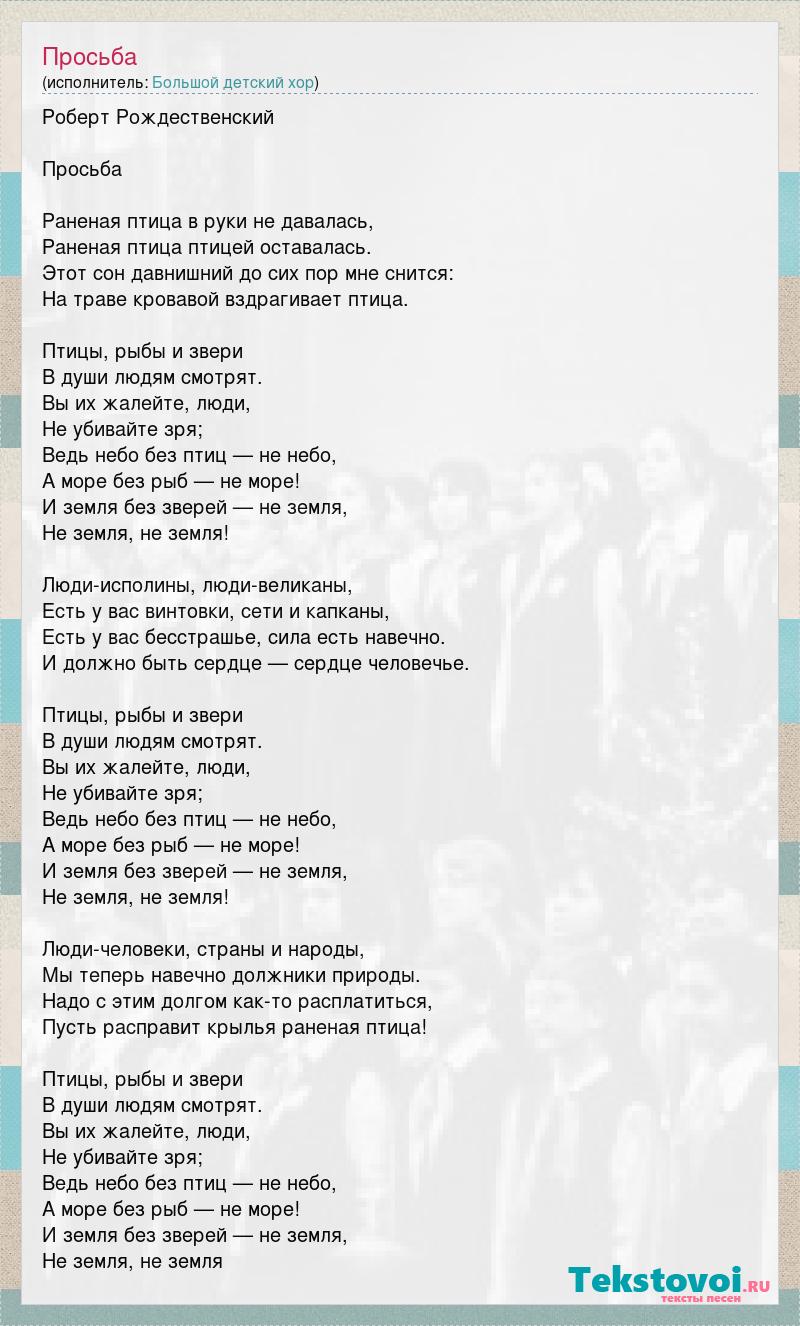 Роберт Рождественский Просьба Раненая птица в руки не давалась, Раненая птица птицей оставалась. Этот сон давнишний до сих пор мне снится: На траве кровавой вздрагивает птица. Птицы, рыбы и звери В души людям смотрят. Вы их жалейте, люди, Не убивайте зря; Ведь небо без птиц — не небо, А море без рыб — не море! И земля без зверей — не земля, Не земля, не земля! Люди-исполины, люди-великаны, Есть у вас винтовки, сети и капканы, Есть у вас бесстрашье, сила есть навечно. И должно быть сердце — сердце человечье. Птицы, рыбы и звери В души людям смотрят. Вы их жалейте, люди, Не убивайте зря; Ведь небо без птиц — не небо, А море без рыб — не море! И земля без зверей — не земля, Не земля, не земля! Люди-человеки, страны и народы, Мы теперь навечно должники природы. Надо с этим долгом как-то расплатиться, Пусть расправит крылья раненая птица! Птицы, рыбы и звери В души людям смотрят. Вы их жалейте, люди, Не убивайте зря; Ведь небо без птиц — не небо, А море без рыб — не море! И земля без зверей — не земля, Не земля, не земля