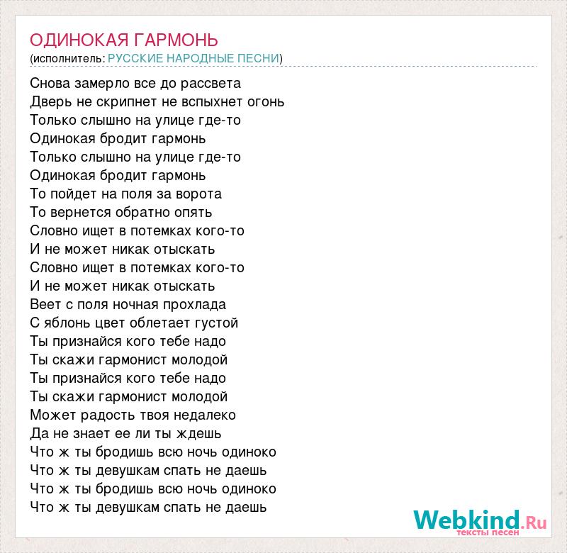 Снова замерло все до рассвета Дверь не скрипнет не вспыхнет огонь Только слышно на улице где-то Одинокая бродит гармонь Только слышно на улице где-то Одинокая бродит гармонь То пойдет на поля за ворота То вернется обратно опять Словно ищет в потемках кого-то И не может никак отыскать Словно ищет в потемках кого-то И не может никак отыскать Веет с поля ночная прохлада С яблонь цвет облетает густой Ты признайся кого тебе надо Ты скажи гармонист молодой Ты признайся кого тебе надо Ты скажи гармонист молодой Может радость твоя недалеко Да не знает ее ли ты ждешь Что ж ты бродишь всю ночь одиноко Что ж ты девушкам спать не даешь Что ж ты бродишь всю ночь одиноко Что ж ты девушкам спать не даешь