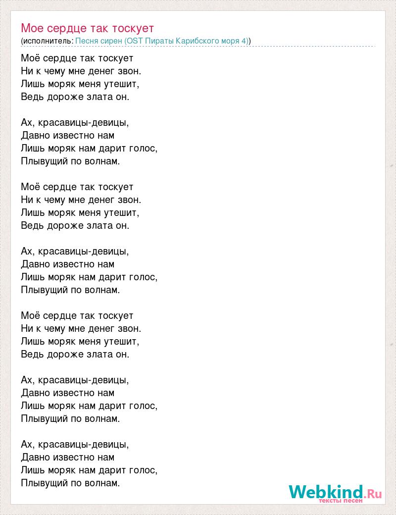 Моё сердце так тоскует Ни к чему мне денег звон. Лишь моряк меня утешит, Ведь дороже злата он. Ах, красавицы-девицы, Давно известно нам Лишь моряк нам дарит голос, Плывущий по волнам. Моё сердце так тоскует Ни к чему мне денег звон. Лишь моряк меня утешит, Ведь дороже злата он. Ах, красавицы-девицы, Давно известно нам Лишь моряк нам дарит голос, Плывущий по волнам. Моё сердце так тоскует Ни к чему мне денег звон. Лишь моряк меня утешит, Ведь дороже злата он. Ах, красавицы-девицы, Давно известно нам Лишь моряк нам дарит голос, Плывущий по волнам. Ах, красавицы-девицы, Давно известно нам Лишь моряк нам дарит голос, Плывущий по волнам.