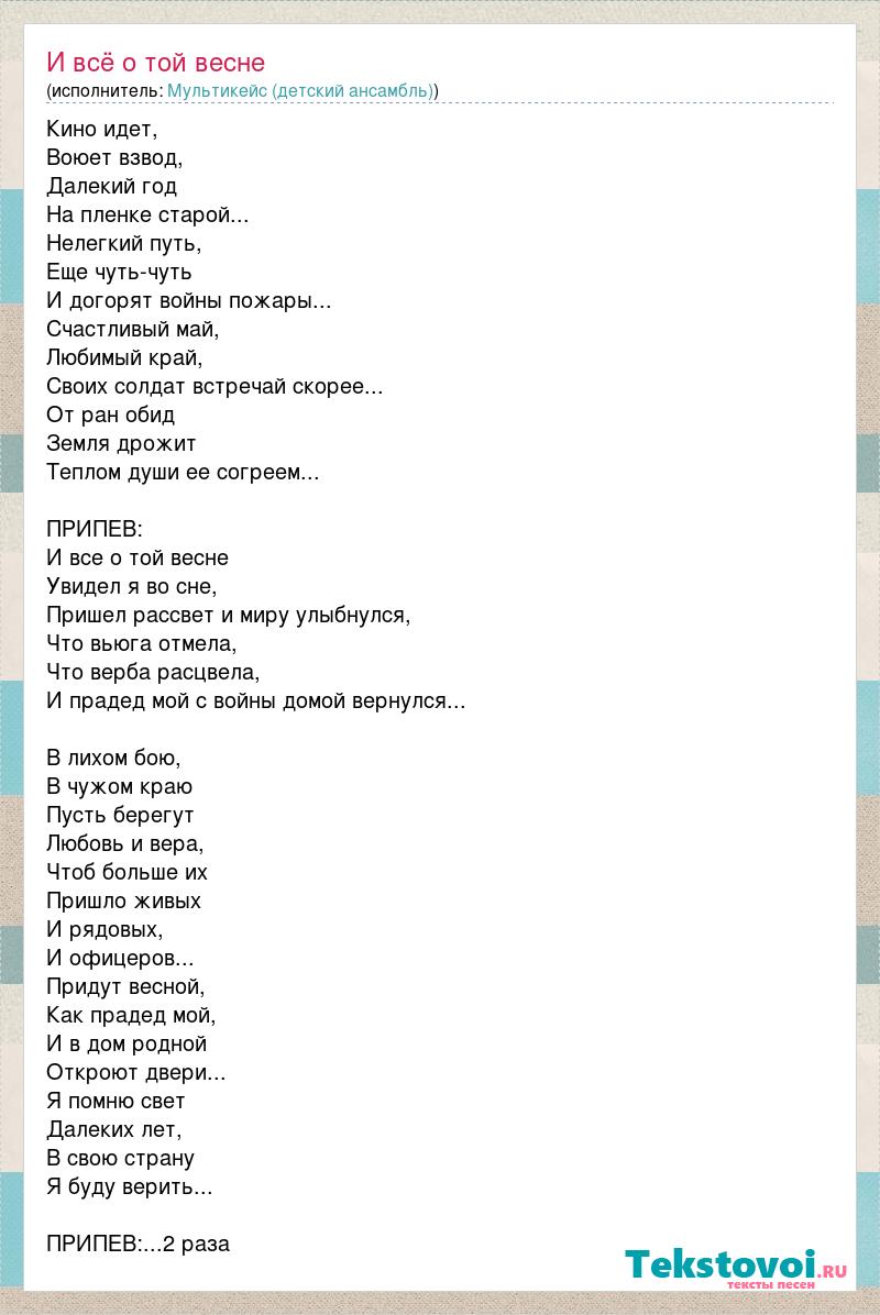 Кино идет, Воюет взвод, Далекий год На пленке старой... Нелегкий путь, Еще чуть-чуть И догорят войны пожары... Счастливый май, Любимый край, Своих солдат встречай скорее... От ран обид Земля дрожит Теплом души ее согреем... ПРИПЕВ: И все о той весне Увидел я во сне, Пришел рассвет и миру улыбнулся, Что вьюга отмела, Что верба расцвела, И прадед мой с войны домой вернулся... В лихом бою, В чужом краю Пусть берегут Любовь и вера, Чтоб больше их Пришло живых И рядовых, И офицеров... Придут весной, Как прадед мой, И в дом родной Откроют двери... Я помню свет Далеких лет, В свою страну Я буду верить... ПРИПЕВ:...2 раза