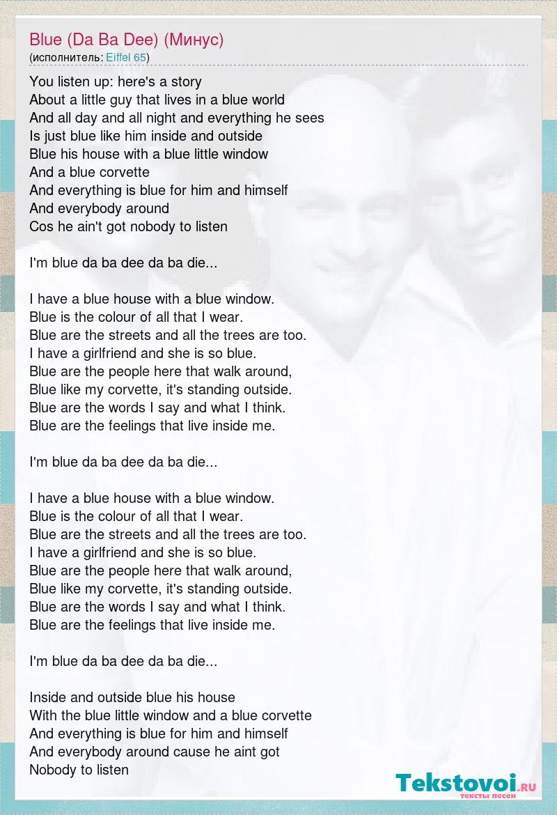 You listen up: here's a story About a little guy that lives in a blue world And all day and all night and everything he sees Is just blue like him inside and outside Blue his house with a blue little window And a blue corvette And everything is blue for him and himself And everybody around Cos he ain't got nobody to listen I'm blue da ba dee da ba die... I have a blue house with a blue window. Blue is the colour of all that I wear. Blue are the streets and all the trees are too. I have a girlfriend and she is so blue. Blue are the people here that walk around, Blue like my corvette, it's standing outside. Blue are the words I say and what I think. Blue are the feelings that live inside me. I'm blue da ba dee da ba die... I have a blue house with a blue window. Blue is the colour of all that I wear. Blue are the streets and all the trees are too. I have a girlfriend and she is so blue. Blue are the people here that walk around, Blue like my corvette, it's standing outside. Blue are the words I say and what I think. Blue are the feelings that live inside me. I'm blue da ba dee da ba die... Inside and outside blue his house With the blue little window and a blue corvette And everything is blue for him and himself And everybody around cause he aint got Nobody to listen