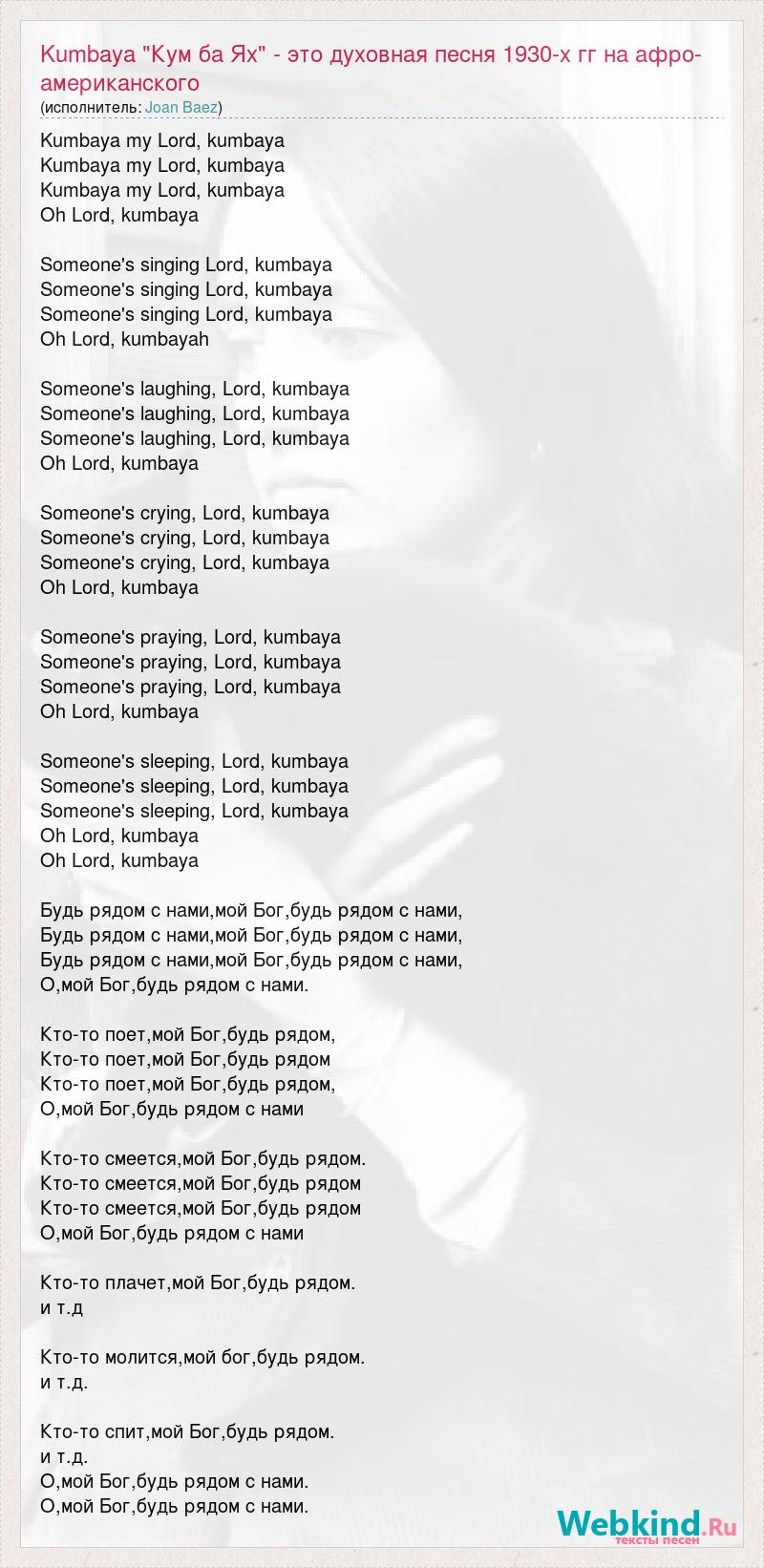 Kumbaya my Lord, kumbaya Kumbaya my Lord, kumbaya Kumbaya my Lord, kumbaya Oh Lord, kumbaya Someone's singing Lord, kumbaya Someone's singing Lord, kumbaya Someone's singing Lord, kumbaya Oh Lord, kumbayah Someone's laughing, Lord, kumbaya Someone's laughing, Lord, kumbaya Someone's laughing, Lord, kumbaya Oh Lord, kumbaya Someone's crying, Lord, kumbaya Someone's crying, Lord, kumbaya Someone's crying, Lord, kumbaya Oh Lord, kumbaya Someone's praying, Lord, kumbaya Someone's praying, Lord, kumbaya Someone's praying, Lord, kumbaya Oh Lord, kumbaya Someone's sleeping, Lord, kumbaya Someone's sleeping, Lord, kumbaya Someone's sleeping, Lord, kumbaya Oh Lord, kumbaya Oh Lord, kumbaya Будь рядом с нами,мой Бог,будь рядом с нами, Будь рядом с нами,мой Бог,будь рядом с нами, Будь рядом с нами,мой Бог,будь рядом с нами, О,мой Бог,будь рядом с нами. Кто-то поет,мой Бог,будь рядом, Кто-то поет,мой Бог,будь рядом Кто-то поет,мой Бог,будь рядом, О,мой Бог,будь рядом с нами Кто-то смеется,мой Бог,будь рядом. Кто-то смеется,мой Бог,будь рядом Кто-то смеется,мой Бог,будь рядом О,мой Бог,будь рядом с нами Кто-то плачет,мой Бог,будь рядом. и т.д Кто-то молится,мой бог,будь рядом. и т.д. Кто-то спит,мой Бог,будь рядом. и т.д. О,мой Бог,будь рядом с нами. О,мой Бог,будь рядом с нами.