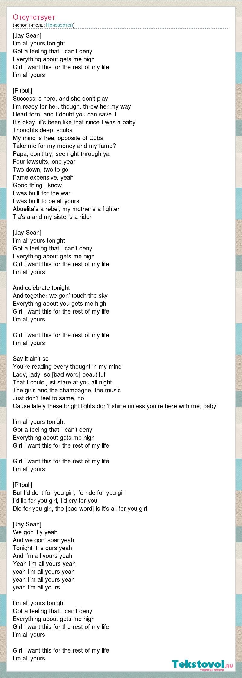 [Jay Sean] I’m all yours tonight Got a feeling that I can’t deny Everything about gets me high Girl I want this for the rest of my life I’m all yours [Pitbull] Success is here, and she don’t play I’m ready for her, though, throw her my way Heart torn, and I doubt you can save it It’s okay, it’s been like that since I was a baby Thoughts deep, scuba My mind is free, opposite of Cuba Take me for my money and my fame? Papa, don’t try, see right through ya Four lawsuits, one year Two down, two to go Fame expensive, yeah Good thing I know I was built for the war I was built to be all yours Abuelita’s a rebel, my mother’s a fighter Tia’s a and my sister’s a rider [Jay Sean] I’m all yours tonight Got a feeling that I can’t deny Everything about gets me high Girl I want this for the rest of my life I’m all yours And celebrate tonight And together we gon’ touch the sky Everything about you gets me high Girl I want this for the rest of my life I’m all yours Girl I want this for the rest of my life I’m all yours Say it ain’t so You’re reading every thought in my mind Lady, lady, so [bad word] beautiful That I could just stare at you all night The girls and the champagne, the music Just don’t feel to same, no Cause lately these bright lights don’t shine unless you’re here with me, baby I’m all yours tonight Got a feeling that I can’t deny Everything about gets me high Girl I want this for the rest of my life Girl I want this for the rest of my life I’m all yours [Pitbull] But I’d do it for you girl, I’d ride for you girl I’d lie for you girl, I’d cry for you Die for you girl, the truth is it’s all for you girl [Jay Sean] We gon’ fly yeah And we gon’ soar yeah Tonight it is ours yeah And I’m all yours yeah Yeah I’m all yours yeah yeah I’m all yours yeah yeah I’m all yours yeah yeah I’m all yours I’m all yours tonight Got a feeling that I can’t deny Everything about gets me high Girl I want this for the rest of my life I’m all yours Girl I want this for the rest of my life I’m all yours