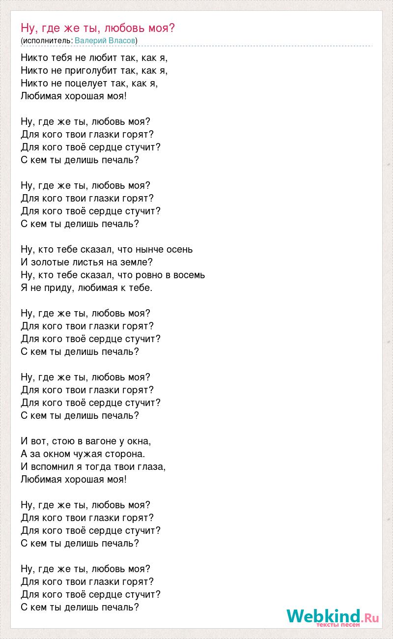 Никто тебя не любит так, как я, Никто не приголубит так, как я, Никто не поцелует так, как я, Любимая хорошая моя! Ну, где же ты, любовь моя? Для кого твои глазки горят? Для кого твоё сердце стучит? С кем ты делишь печаль? Ну, где же ты, любовь моя? Для кого твои глазки горят? Для кого твоё сердце стучит? С кем ты делишь печаль? Ну, кто тебе сказал, что нынче осень И золотые листья на земле? Ну, кто тебе сказал, что ровно в восемь Я не приду, любимая к тебе. Ну, где же ты, любовь моя? Для кого твои глазки горят? Для кого твоё сердце стучит? С кем ты делишь печаль? Ну, где же ты, любовь моя? Для кого твои глазки горят? Для кого твоё сердце стучит? С кем ты делишь печаль? И вот, стою в вагоне у окна, А за окном чужая сторона. И вспомнил я тогда твои глаза, Любимая хорошая моя! Ну, где же ты, любовь моя? Для кого твои глазки горят? Для кого твоё сердце стучит? С кем ты делишь печаль? Ну, где же ты, любовь моя? Для кого твои глазки горят? Для кого твоё сердце стучит? С кем ты делишь печаль?
