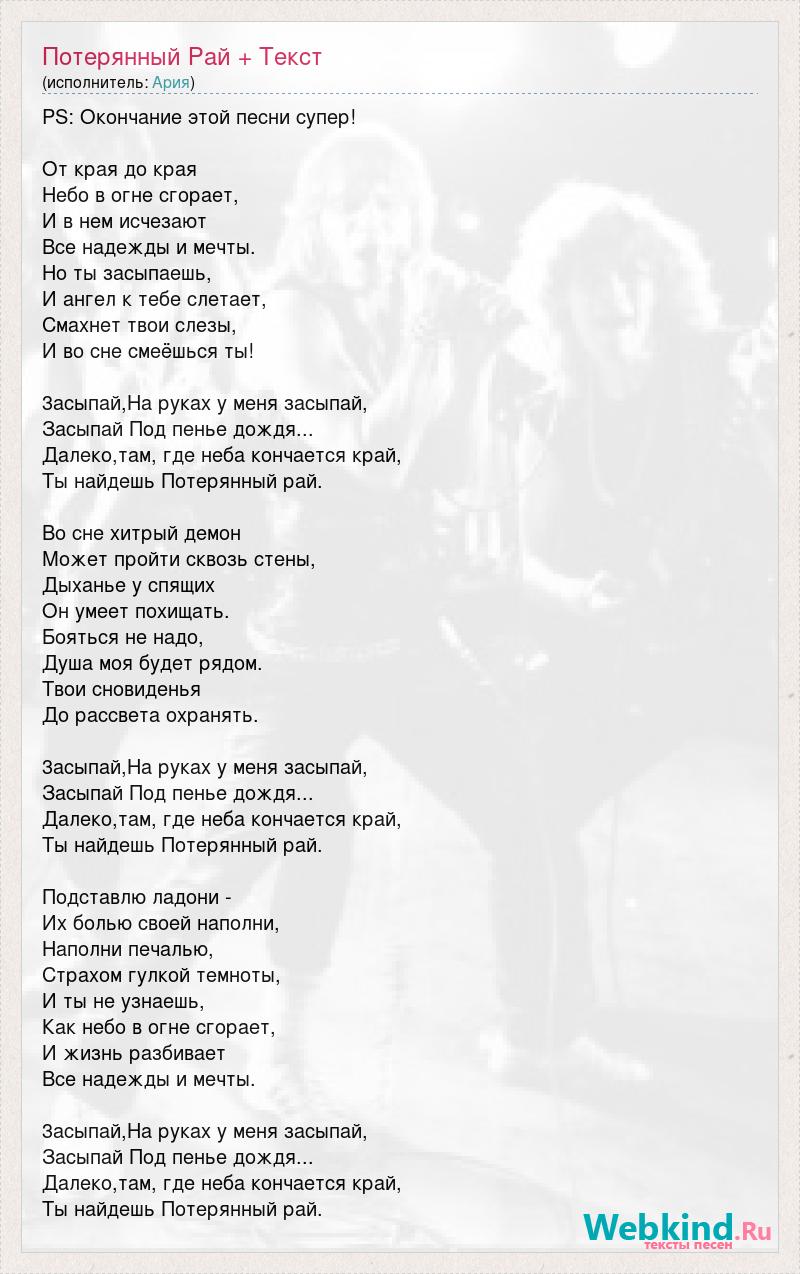 PS: Окончание этой песни супер! От края до края Небо в огне сгорает, И в нем исчезают Все надежды и мечты. Но ты засыпаешь, И ангел к тебе слетает, Смахнет твои слезы, И во сне смеёшься ты! 3асыпай,На руках у меня засыпай, Засыпай Под пенье дождя... Далеко,там, где неба кончается край, Ты найдешь Потерянный рай. Во сне хитрый демон Может пройти сквозь стены, Дыханье у спящих Он умеет похищать. Бояться не надо, Душа моя будет рядом. Твои сновиденья До рассвета охранять. 3асыпай,На руках у меня засыпай, Засыпай Под пенье дождя... Далеко,там, где неба кончается край, Ты найдешь Потерянный рай. Подставлю ладони - Их болью своей наполни, Наполни печалью, Страхом гулкой темноты, И ты не узнаешь, Как небо в огне сгорает, И жизнь разбивает Все надежды и мечты. 3асыпай,На руках у меня засыпай, Засыпай Под пенье дождя... Далеко,там, где неба кончается край, Ты найдешь Потерянный рай.