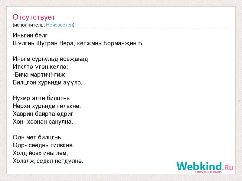 Иньгин белг Шүлгнь Шугран Вера, көгҗмнь Борманҗин Б. Иньгм сурһульд йовҗаһад Итклтә үгән келлә: -Бичә мартич!-гиҗ Билцгән хурһндм зүүлә. Нухмр алтн билцгнь Нәрхн хурһндм гилвкнә. Хаврин байрта өдриг Хөн- хөөнән санулна. Одн мет билцгнь Өдр- сөөднь гилвкнә. Холд йовх иньгләм, Холвлҗ седкл негдүлнә.