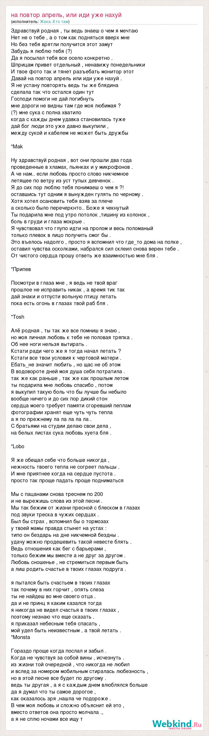 Здравствуй родная , ты ведь знаеш о чем я мечтаю Нет не о тебе , а о том как подняться вверх мне Но без тебя врятли получится этот замут Забудь я люблю тебя (?) Да я посылал тебя все осело конкретно . Шприцам привет отдельный , ненавижу понедельники И твое фото так и тянет разъебать монитор этот Давай на повтор апрель или иди уже нахуй . Я не устану повторять ведь ты же блядина сделала так что остался один тут Господи помоги не дай погибнуть мне дороги не видны там где моя любимая ? (?) мне сука с полна хватило когда с кажды днем удавка становилась туже дай бог люди это уже давно выкупили , между сукой и кабелем не может быть дружбы "Mak Ну здравствуй родная , вот они прошли два года проведенные в хламах, пьянках и у микрофонов . А че нам.. если любовь просто слово никчемное летящее по ветру из уст тупых девченок . Я до сих пор люблю тебя понимаеш о чем я ?! оставшись тут одним я вынужден гулять по черному . Хотя хотел осановить тебя взяв за плече а сколько было перечеркнто.. Боже я чекнутый Ты подарила мне под утро потолок ,тишину из колонок , боль в груди и глаза мокрые . Я чувствовал что глупо идти на пролом и весь поломаный только плевок в лицо получить смог бы . Это въелось надолго , просто я вспомнил что где_то дома на полке , оставил чувства осколками, набрался сил склеил снова верен тебе . От чистого сердца прошу ответь же взаимностью мне бля . "Припев Посмотри в глаза мне , я ведь не твой враг прошлое не исправить никак , а время тик так дай знаки и отпусти вольную птицу летать пока есть огонь в глазах твой раб бля . "Tosh Алё родная , ты так же все помниш я знаю , но моя личная любовь к тебе не половая тряпка . Об нее ноги нельзя вытирать . Кстати ради чего же я тогда начал летать ? Кстати все твои условия к чертовой матери . Ебать_не значит любить , но щас не об этом В водовороте дней моя душа себя потратила . так же как раньше , так же как прошлым летом ты подарила мне любовь спасибо , потом я выкупил такую боль что бы лучше бы небыло вообще ничего и до сих пор дикий стон сердца моего требует памяти сгоревший пеплам фотографии хранят еще чуть чуть тепла а я по прежнему ла ла ла ла ла . С братьями на студии делаю свои дела , на белых листах сука любовь хуета бля . "Lobo Я же обещал себе что больше никогда , нежность твоего тепла не согреет пальцы . И мне приятнее когда на сердце пустота . просто так проще падать проще подниматься Мы с пацанами снова треснем по 200 и не вырежишь слова из этой песни . Мы так бежим от жизни пресной с блеском в глазах под звуки треска в чужих сердцах . Был бы страх , вспомнил бы о тормозах у твоей мамы правда стынет на устах : типо он бездарь на дне никчемной бездны . удачу можно продешевить такой невесте блять . Ведь отношения как бег с барьерами , только бежим мы вместе а не друг за другом . Любовь сношенье , не стремиться первым быть а лиш родить счастье в твоих глазах подруга . я пытался быть счастьем в твоих глазах так почему в них горчит , опять слеза ты не найдеш во мне своего отца . да и не принц я каким казался тогда я никогда не видел счастья в твоих глазах , поэтому незнаю что еще сказать . я приказал небесным тебя спасать , мой удел быть неизвестным , а твой летать . "Monsta Гораздо проще когда послал и забыл . Когда не чувствуя за собой вины , исчезнуть . из жизни той очередной , что никогда не любил и вслед за номером мобильным стиралась любезность , но в этой п
